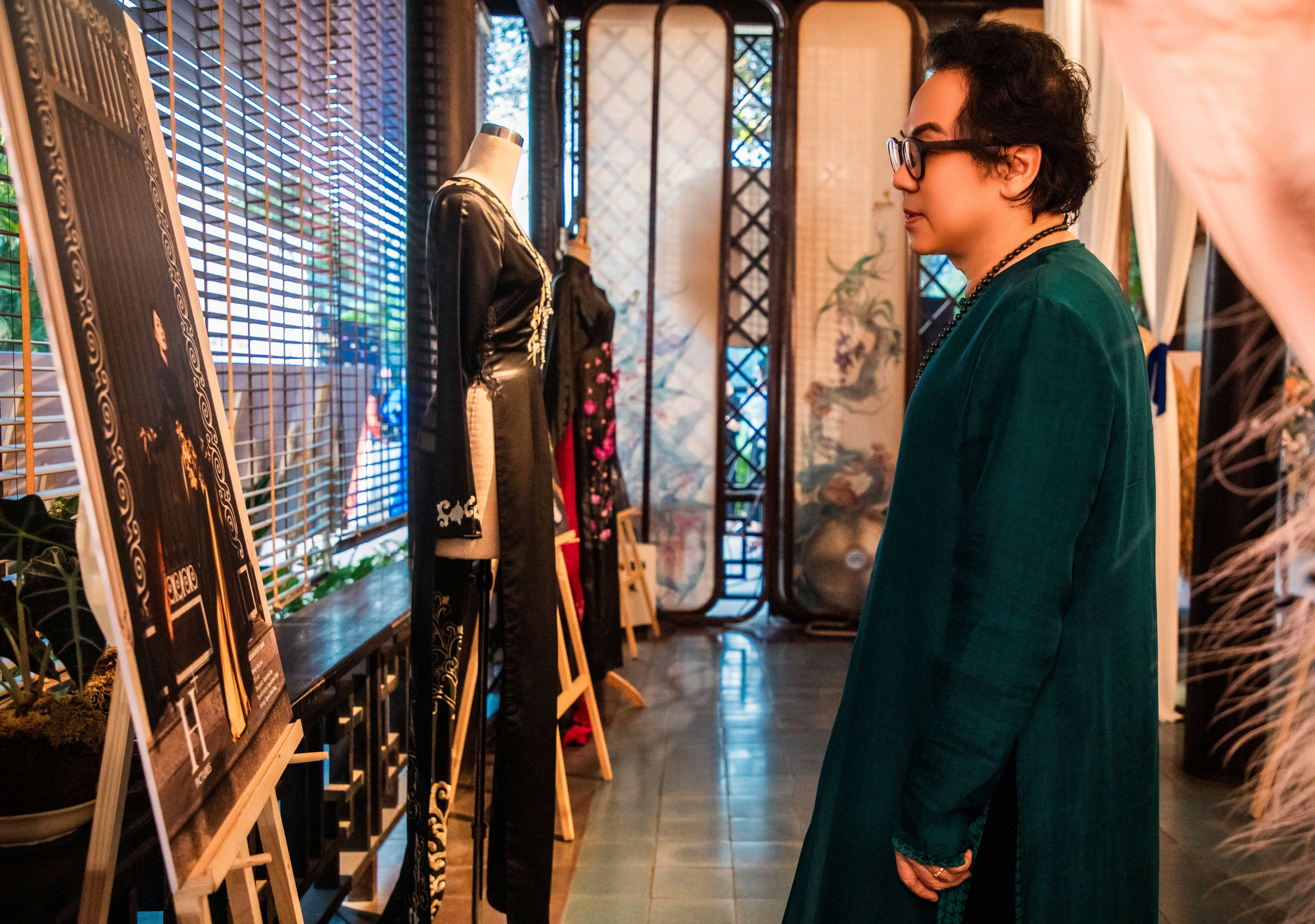 Artist Huu Chau wore a monochromatic ao dai to the event. |