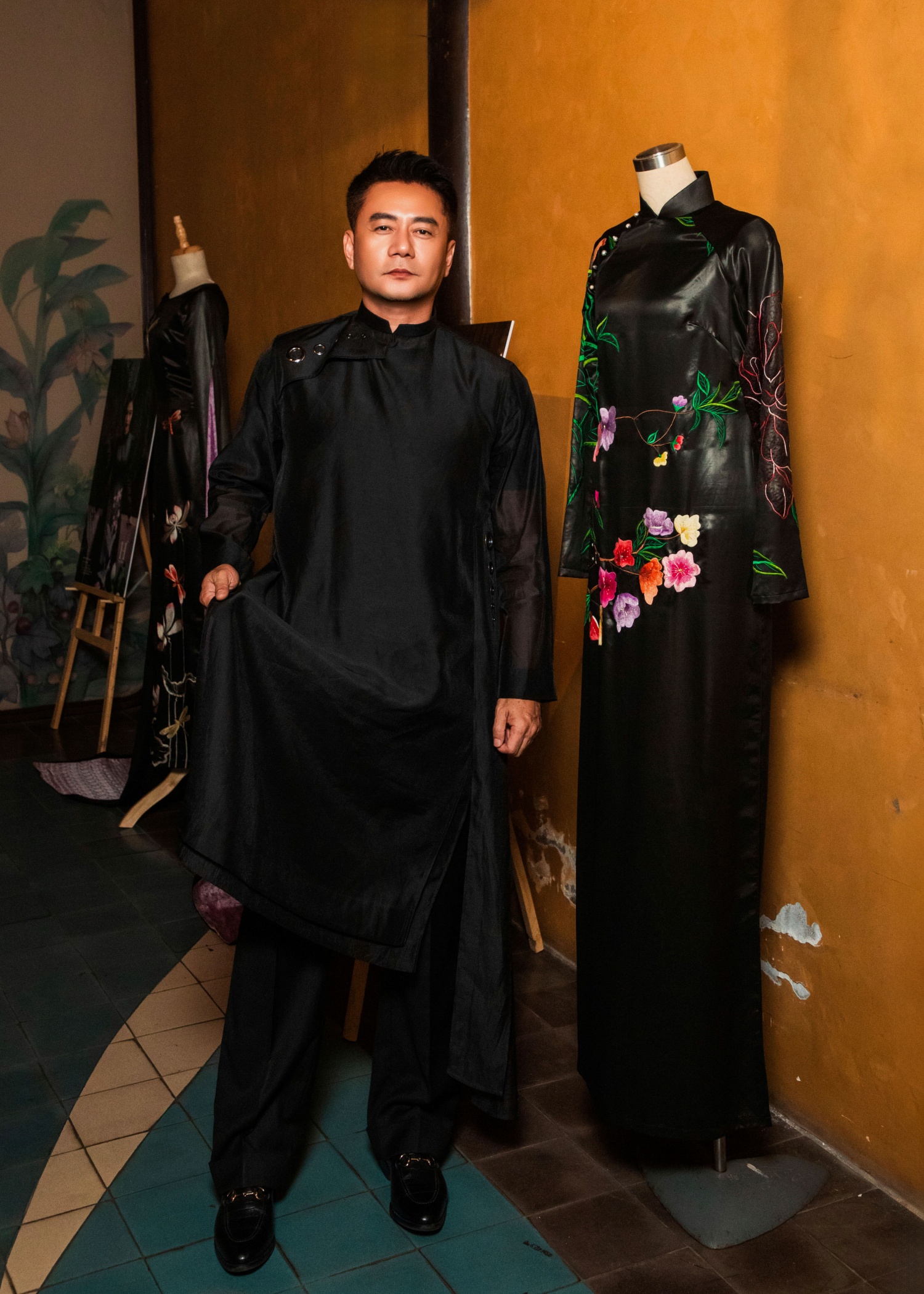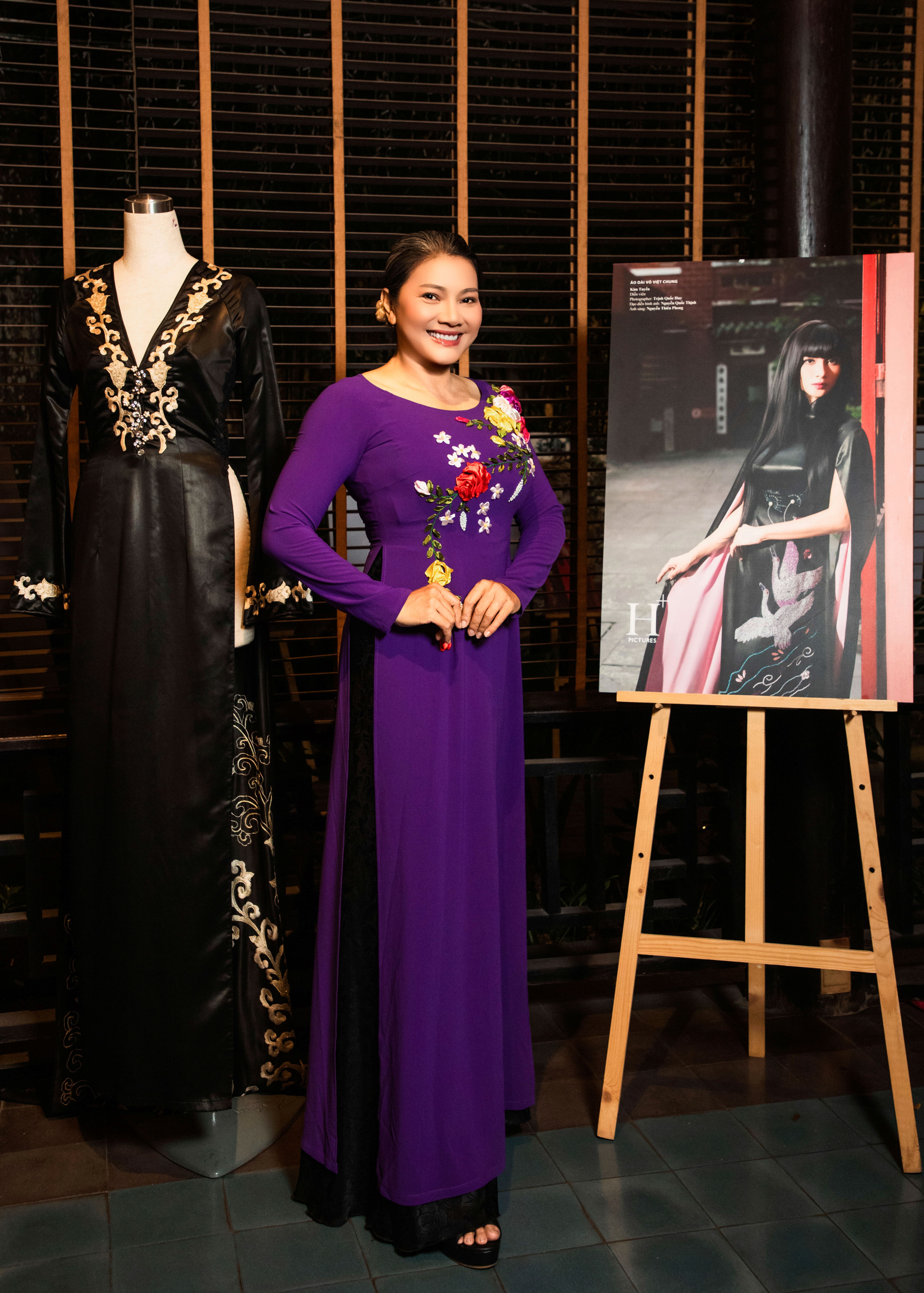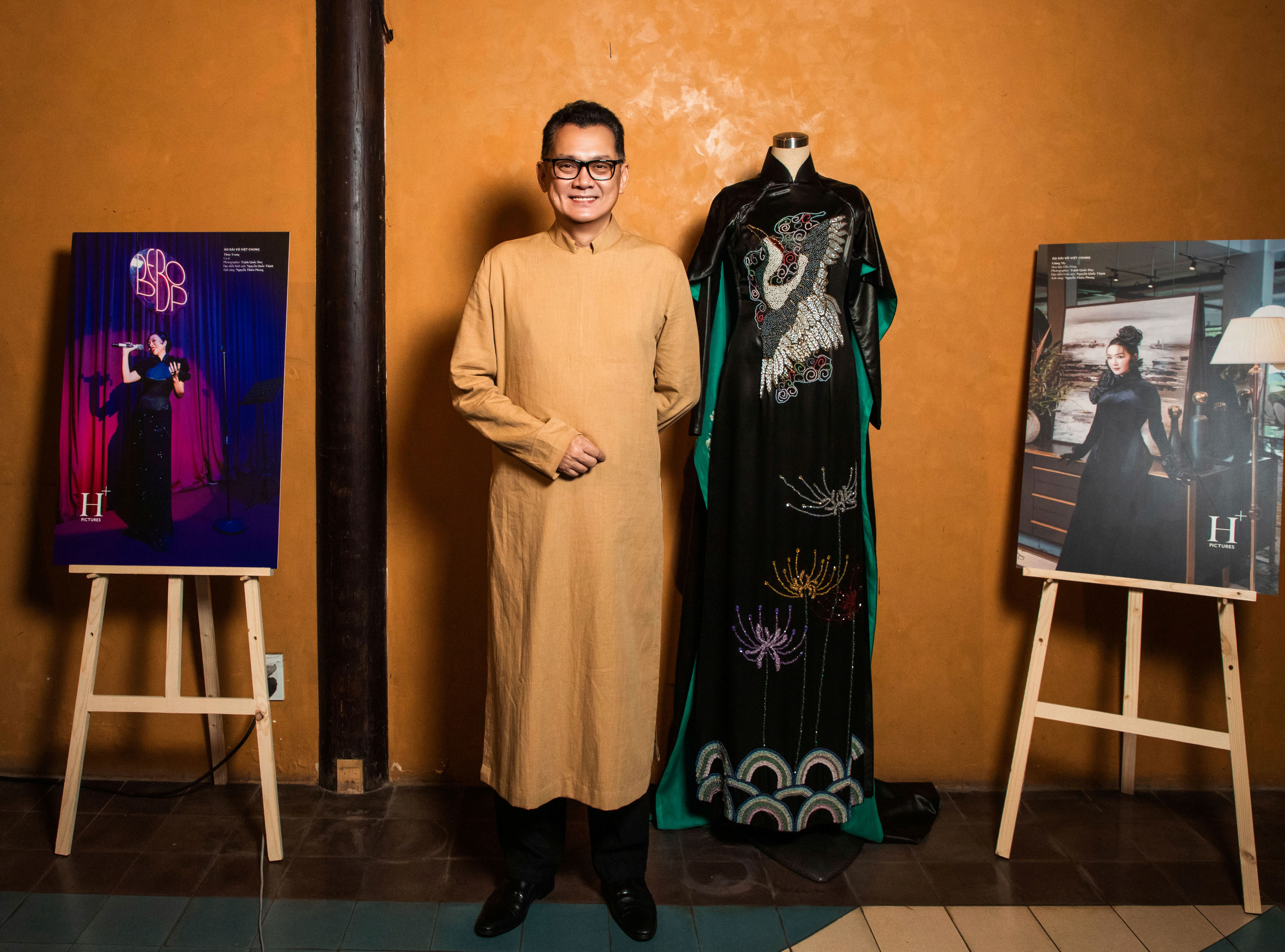The venue featured an ao dai display and photographs of 30 beauties who have worn the designer's creations. An adjacent runway presented three new collections. Actor Thanh Loc toured the exhibition, designed with an antique aesthetic. He expressed his appreciation for Vo Viet Chung's designs, highlighting their traditional forms and materials which honor Vietnamese heritage.