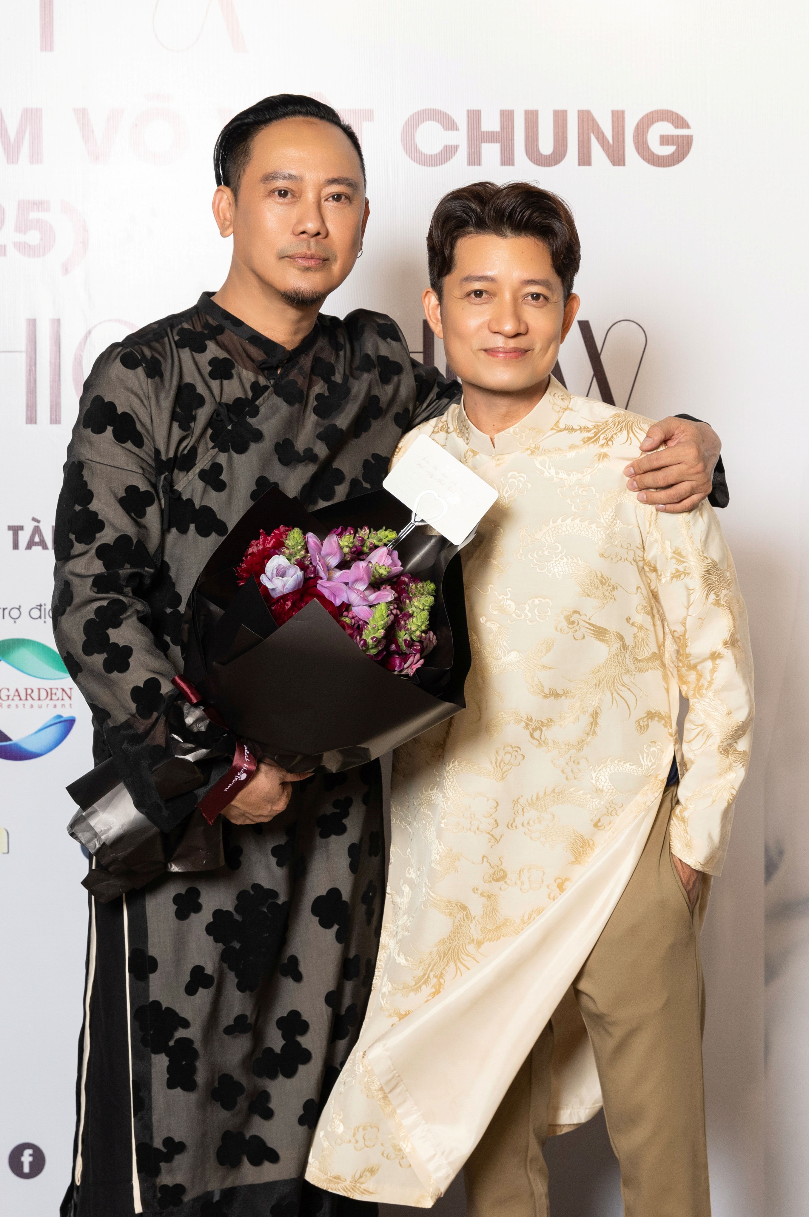 Actor Thanh Loc (right) congratulated designer Vo Viet Chung on his 30th anniversary in the profession at the event on 22/12. They have known each other for many years in the entertainment industry. |