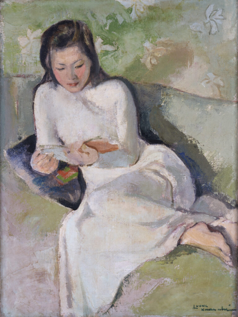 "Vietnam: The Landscape of Memories" is divided into four sections. The first presents works by artists from the Indochina Fine Arts College, including "Young Girl Reading" (1940) by Luong Xuan Nhi, "Playing O An Quan" (1931) by Nguyen Phan Chanh, and "Girl Looking at a Painting of a Beauty" (1938) by To Ngoc Van.