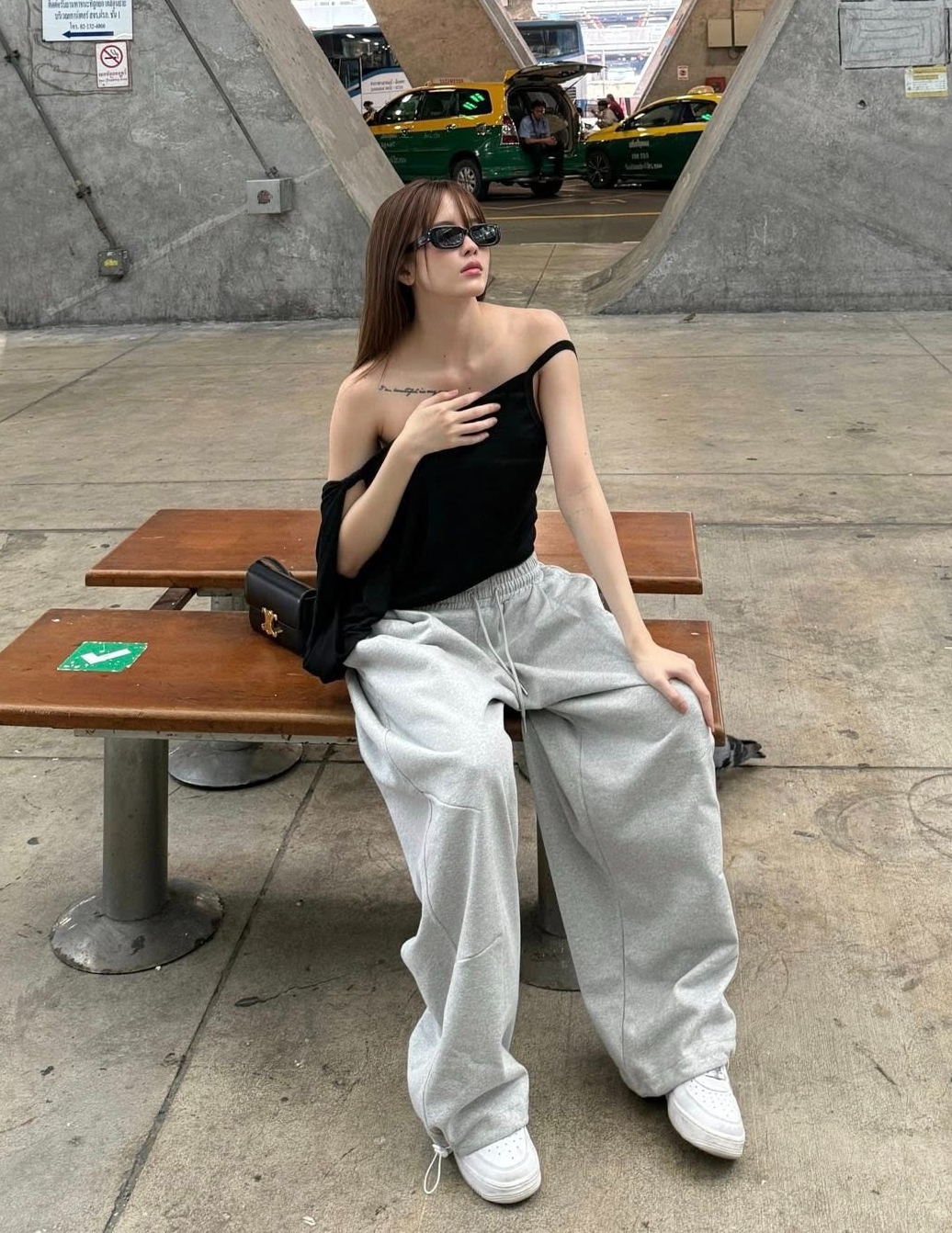 Thieu Bao Tram's airport fashion featured a relaxed off-the-shoulder top, sweatpants, and sneakers.