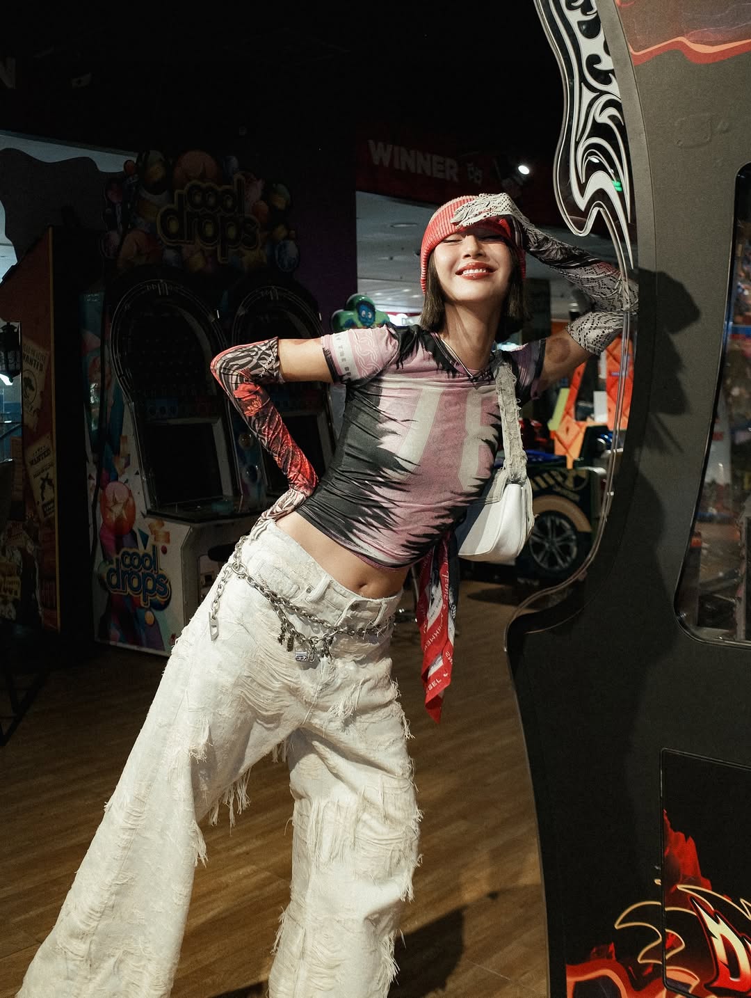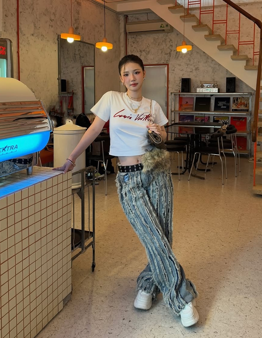 Fashionista Quynh Anh Shyn embraced the Y2K aesthetic with a sporty t-shirt, ripped wide-leg pants, and a chain belt.