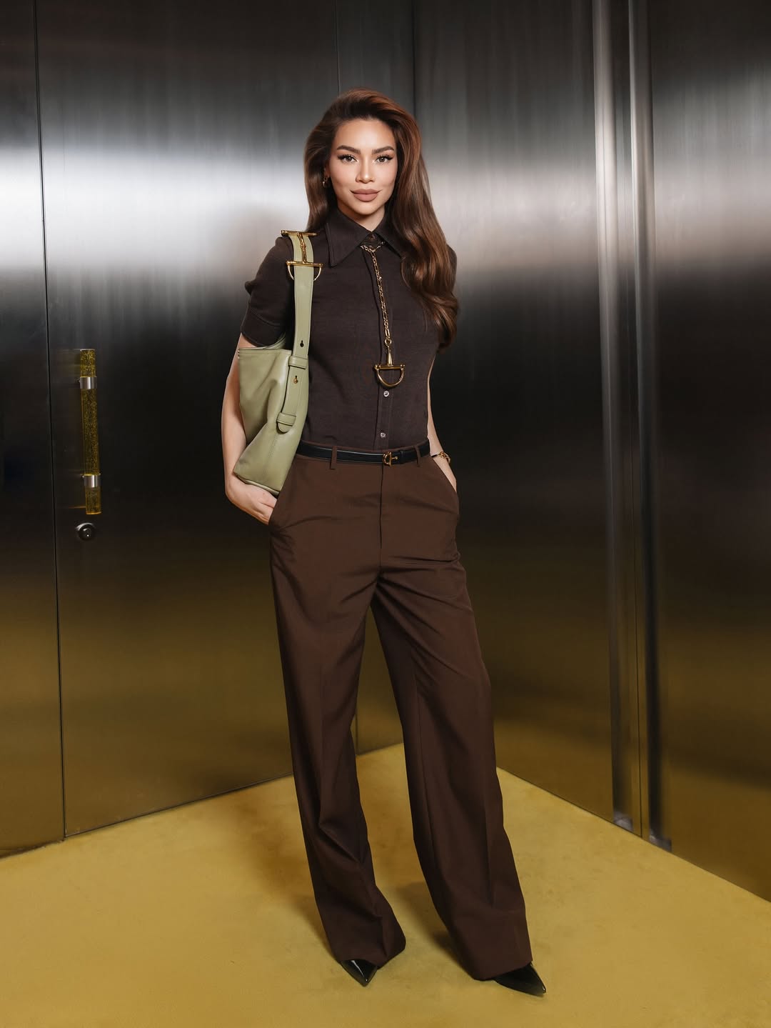 At an event in early August, Ho Ngoc Ha paired wide-leg pants with a knitted polo shirt in this year's hottest brown hue. The simple outfit exuded elegance with pointed-toe shoes, a neatly tucked shirt, and a long, eye-catching necklace.
