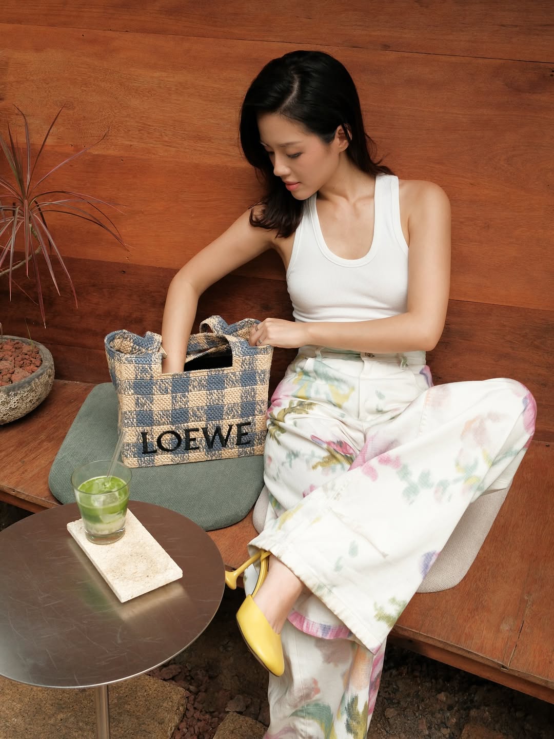 Model Khanh Linh showcased feminine elegance with floral wide-leg pants, a tank top, and Loewe heels.