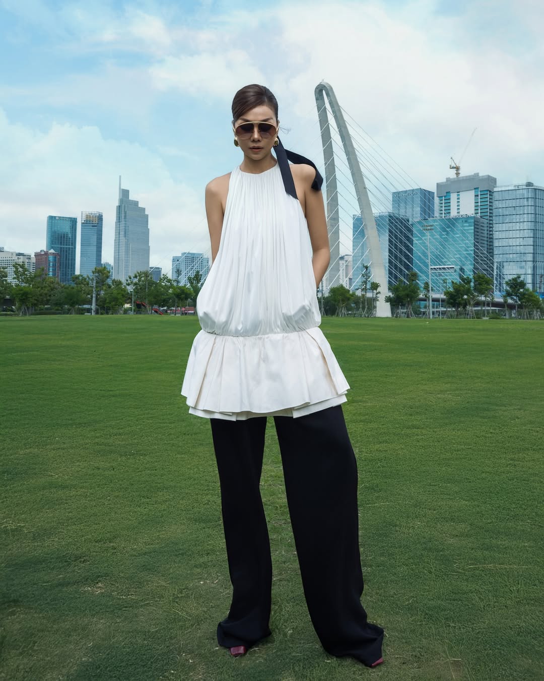 During a trip to Ha Long in June, Diep Lam Anh accentuated her waist with an off-the-shoulder crop top and high-waisted wide-leg pants.