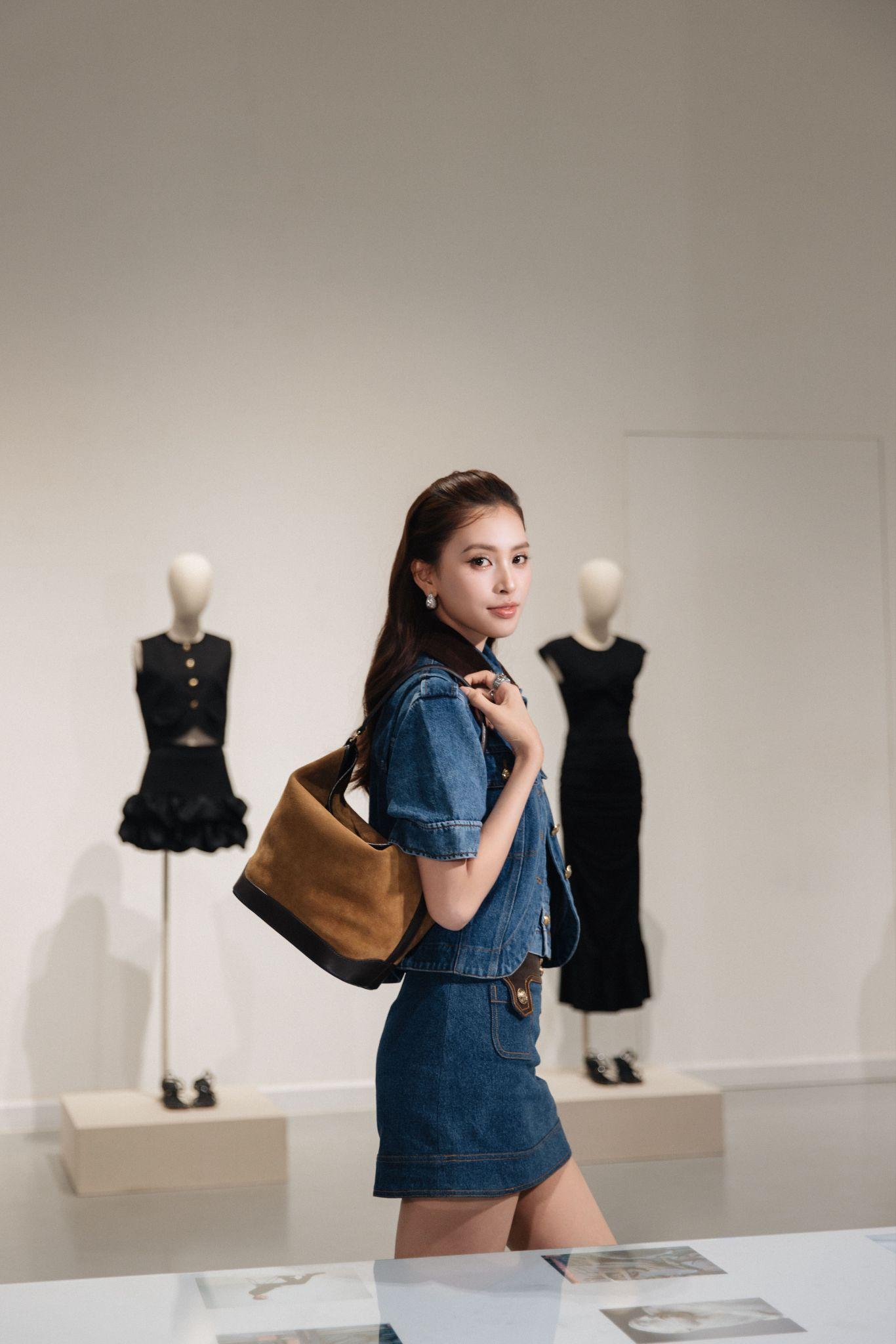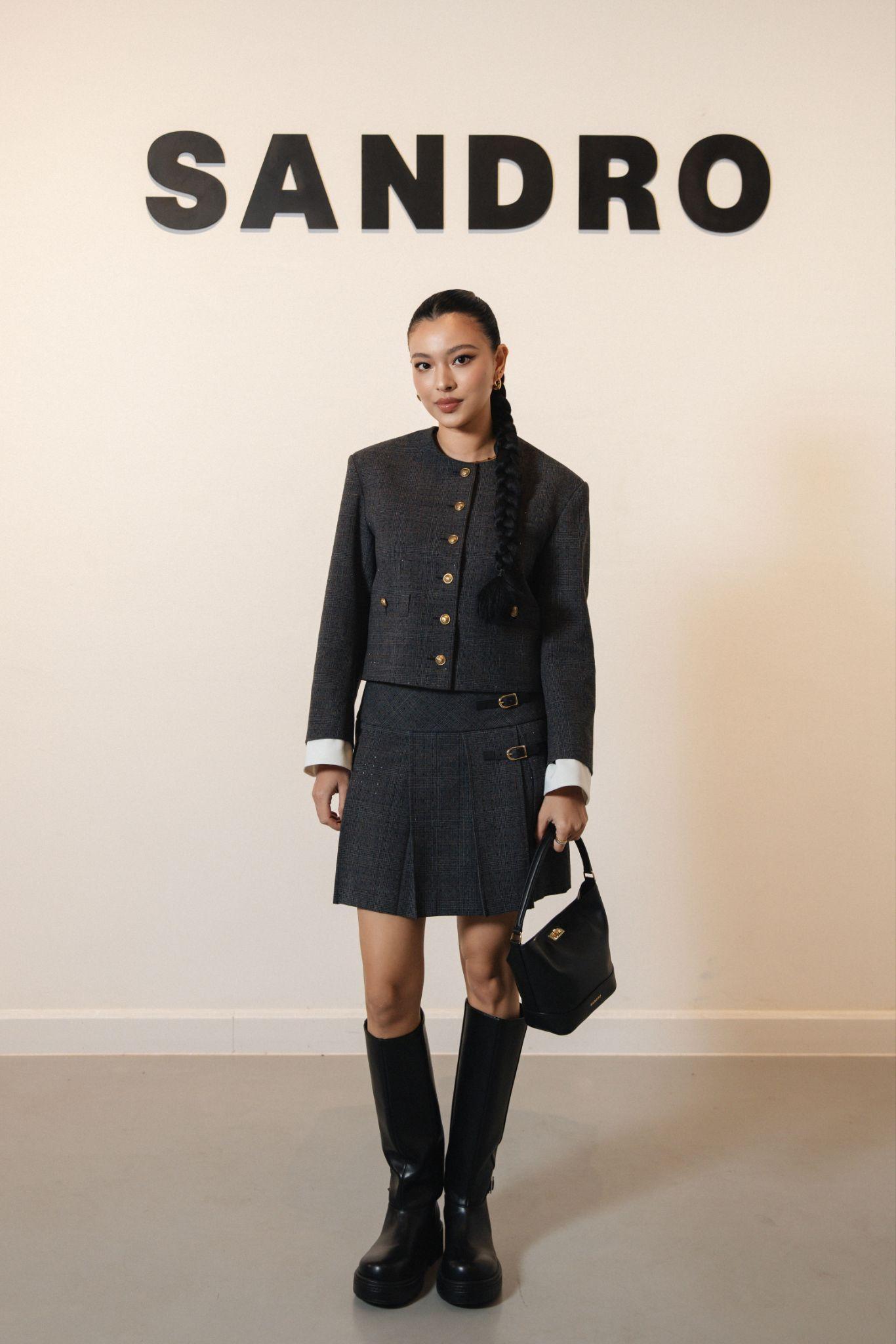 Tieu Vy paired a denim-on-denim blouse and skirt with a brown handbag for a feminine look. This year, Sandro brings back denim designs alongside motorcycle boots and form-fitting pieces, interwoven with a rebellious Y2K vibe. Photo: Sandro