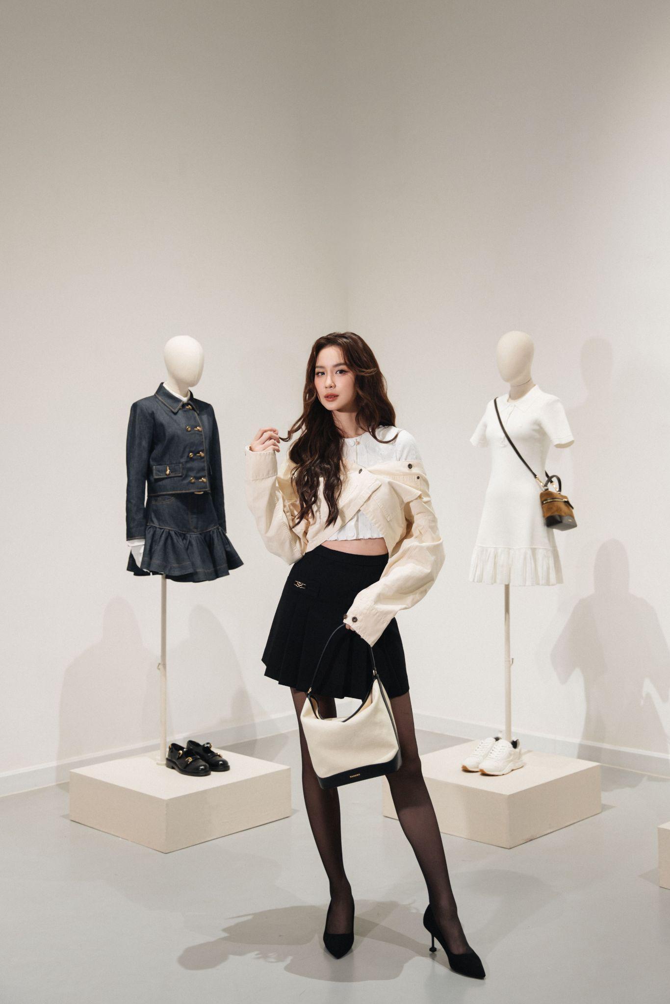 Tieu Vy paired a denim-on-denim blouse and skirt with a brown handbag for a feminine look. This year, Sandro brings back denim designs alongside motorcycle boots and form-fitting pieces, interwoven with a rebellious Y2K vibe. Photo: Sandro |