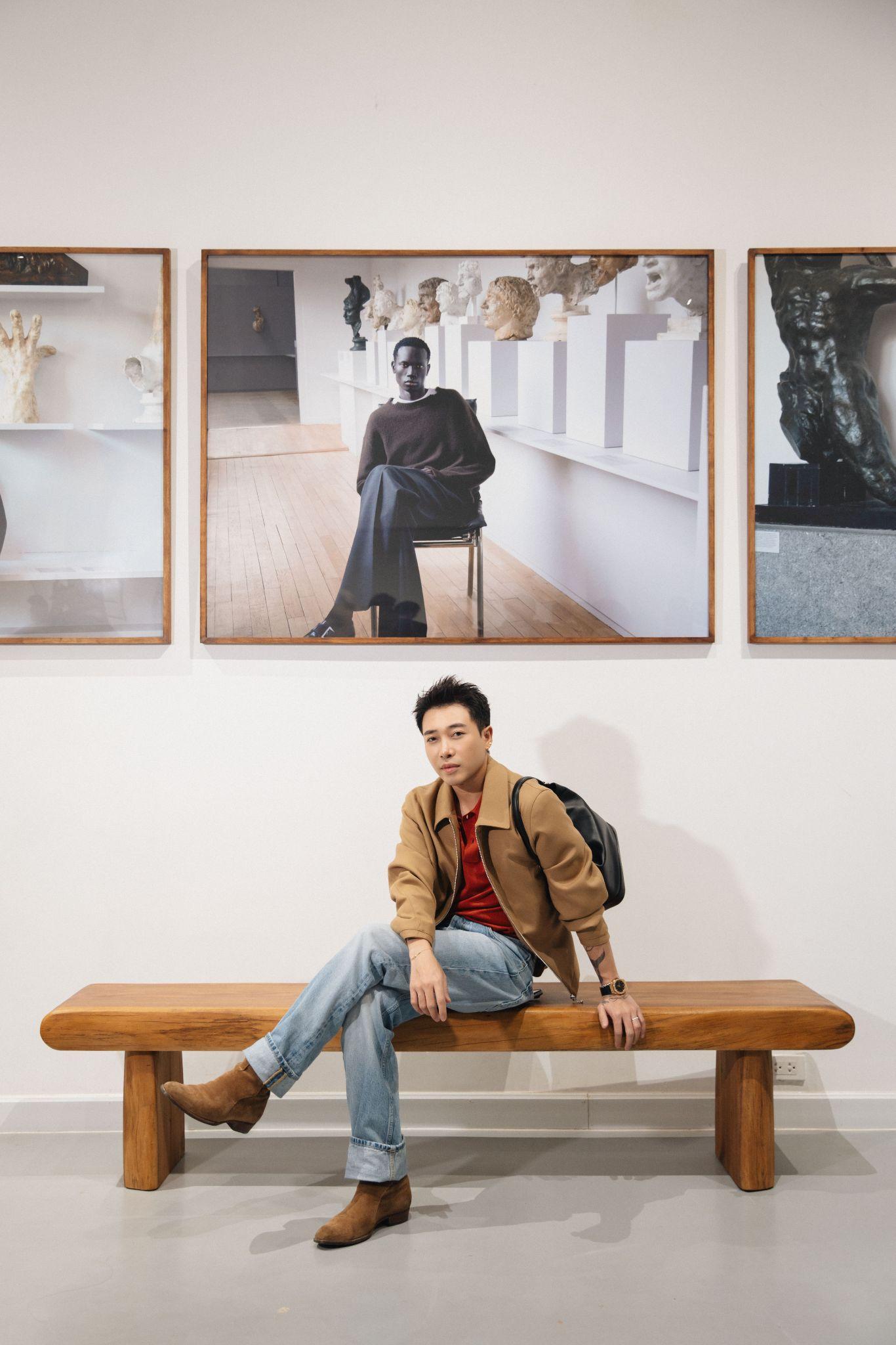 Stylist Hoang Ku attended the event with a rugged look, pairing a vibrant red polo shirt with a camel-colored jacket, light-colored jeans, and suede boots. Photo: Sandro |