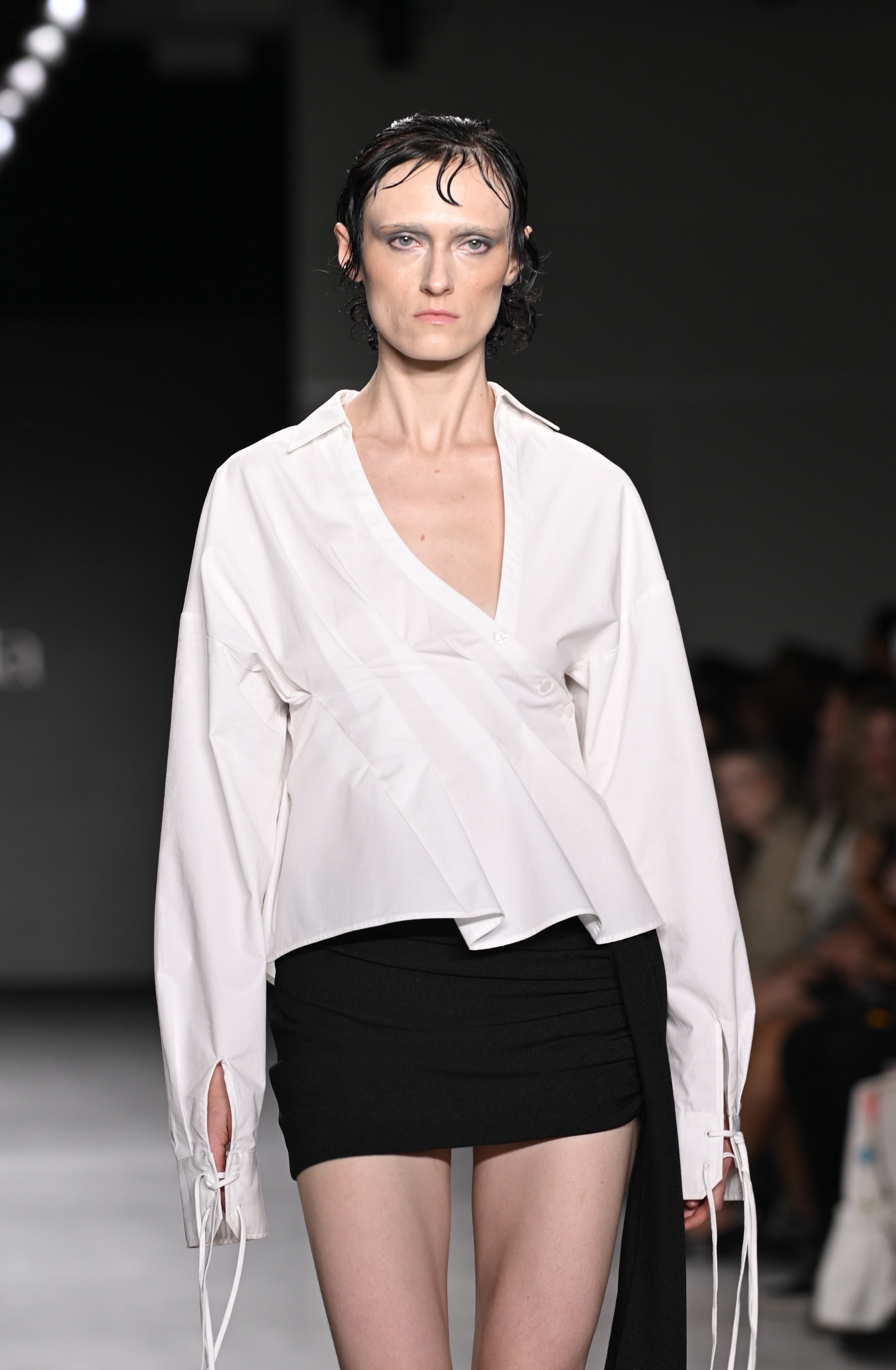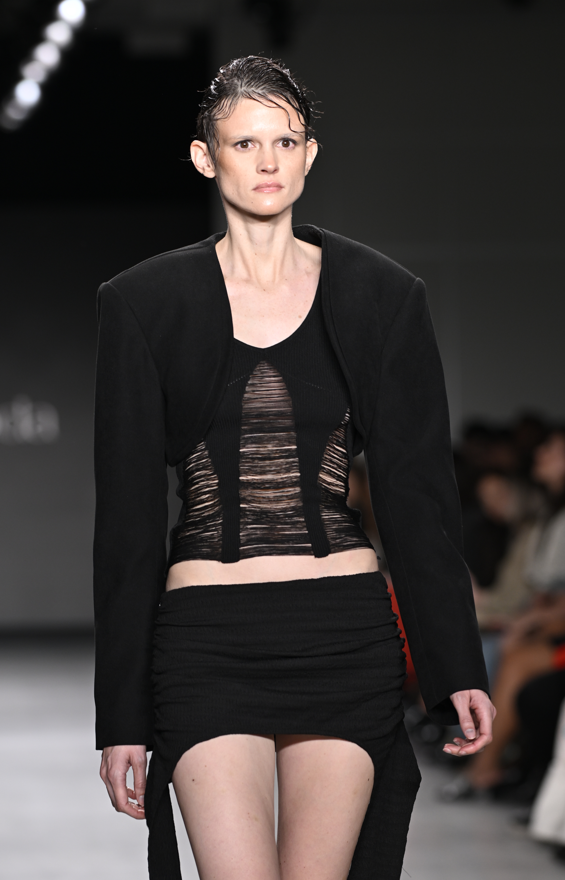 Traditional office staples like gilet vests and pleated skirts are reimagined with deep cuts at the chest and hips, transforming them into bodysuits and ultra-short, low-rise skirts. |