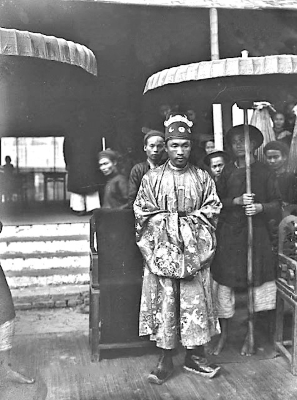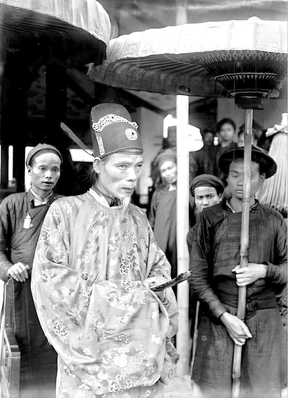 Governor-General Cao Xuan Duc attending the 1897 examination. He held various official positions under the Nguyen Dynasty after passing the regional exam in 1876. He was a conscious collector and preserver of ancient books, diligently hiring scribes to copy valuable texts, and established the Long Cuong Bao Tang Library, one of the largest libraries in the former Nghe Tinh province. |