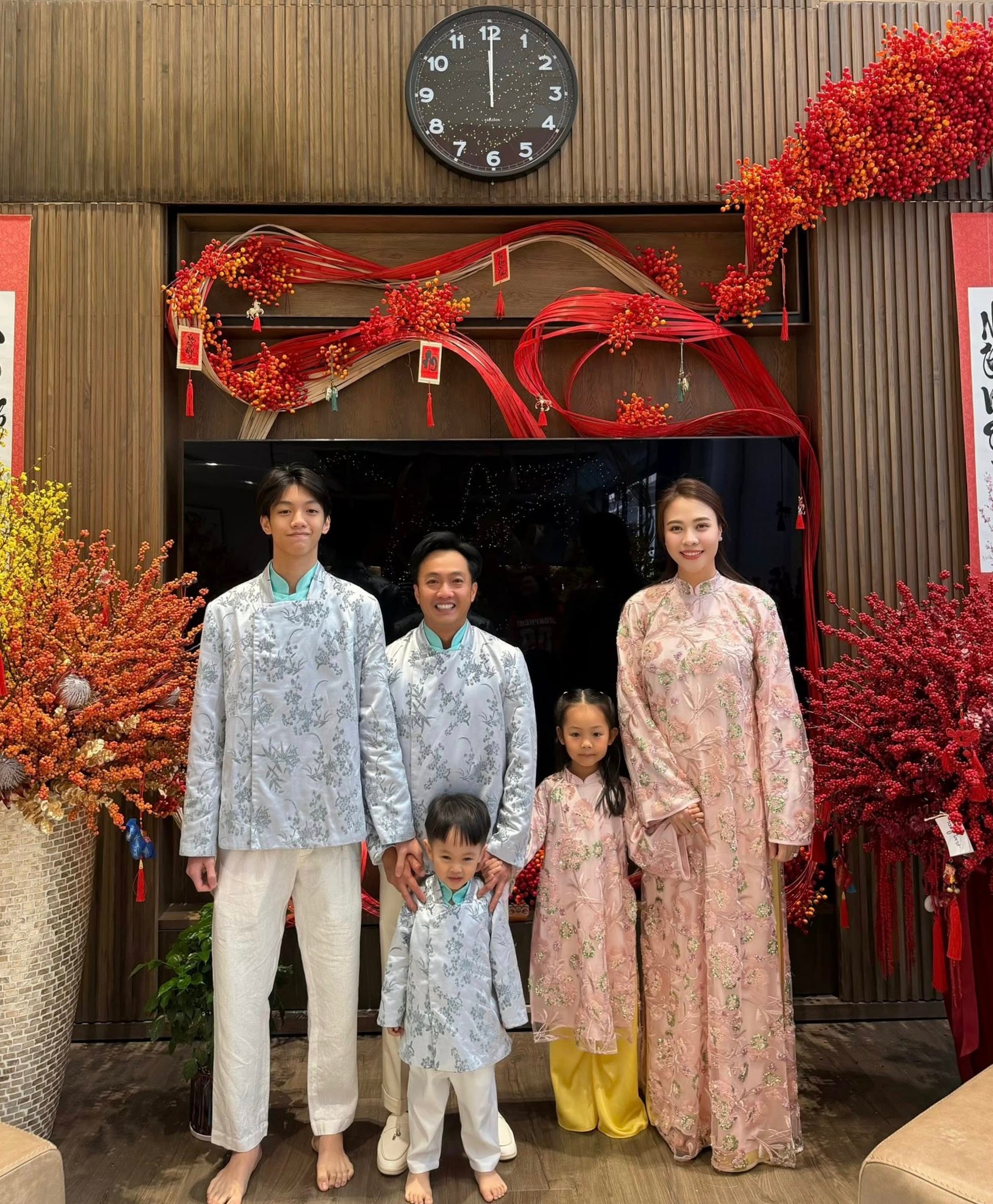 Dam Thu Trang and her six-year-old daughter, Suchin, wore matching ao dai, while Cuong Do La and his two sons wore coordinated outfits with floral embroidery. Subeo (left), 16 years old and Cuong Do La's son from a previous marriage, is the tallest in the family at 1,8 m. The businessman stated that his greatest wish for the new year is for his parents to be healthy and his family to be safe.