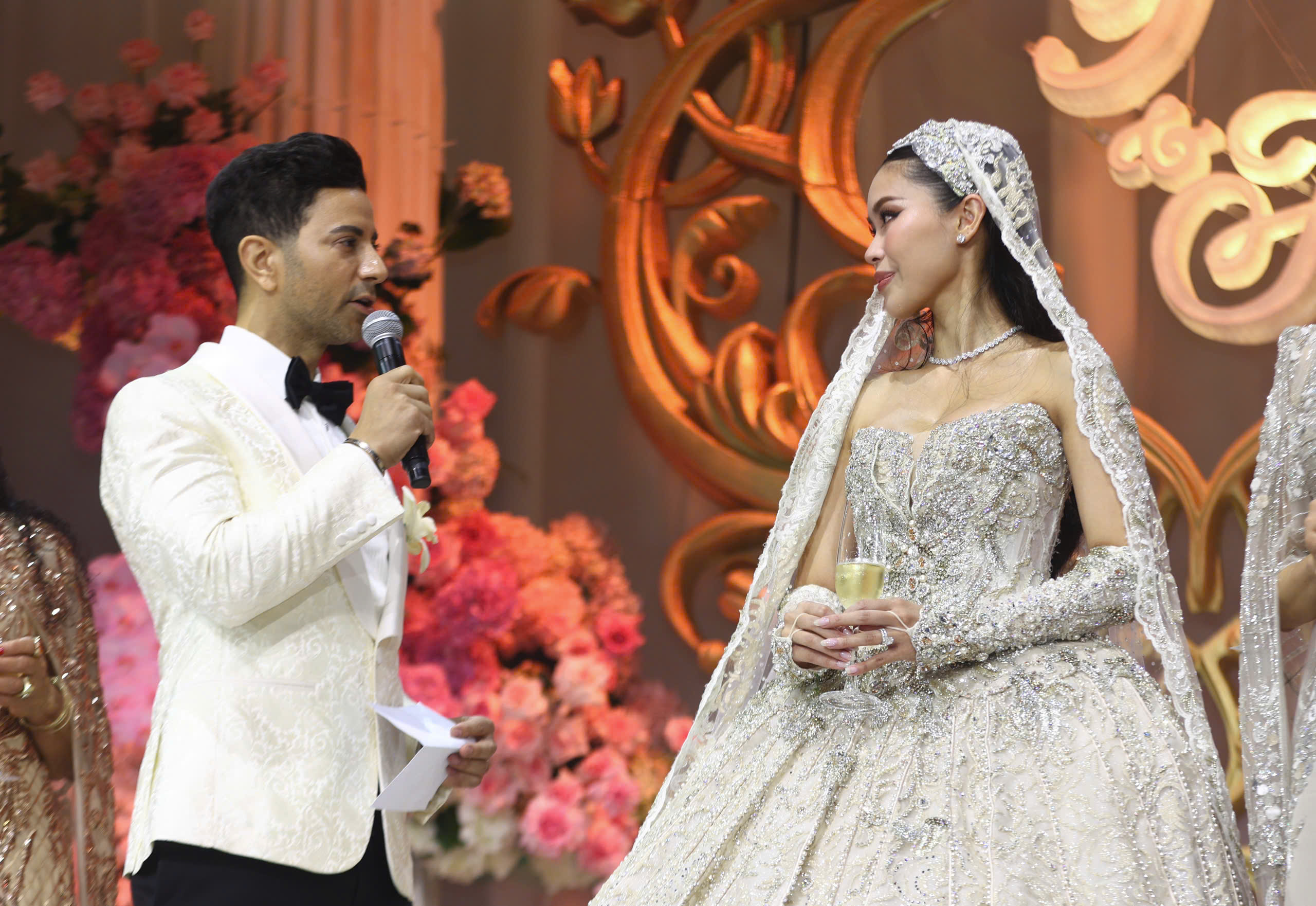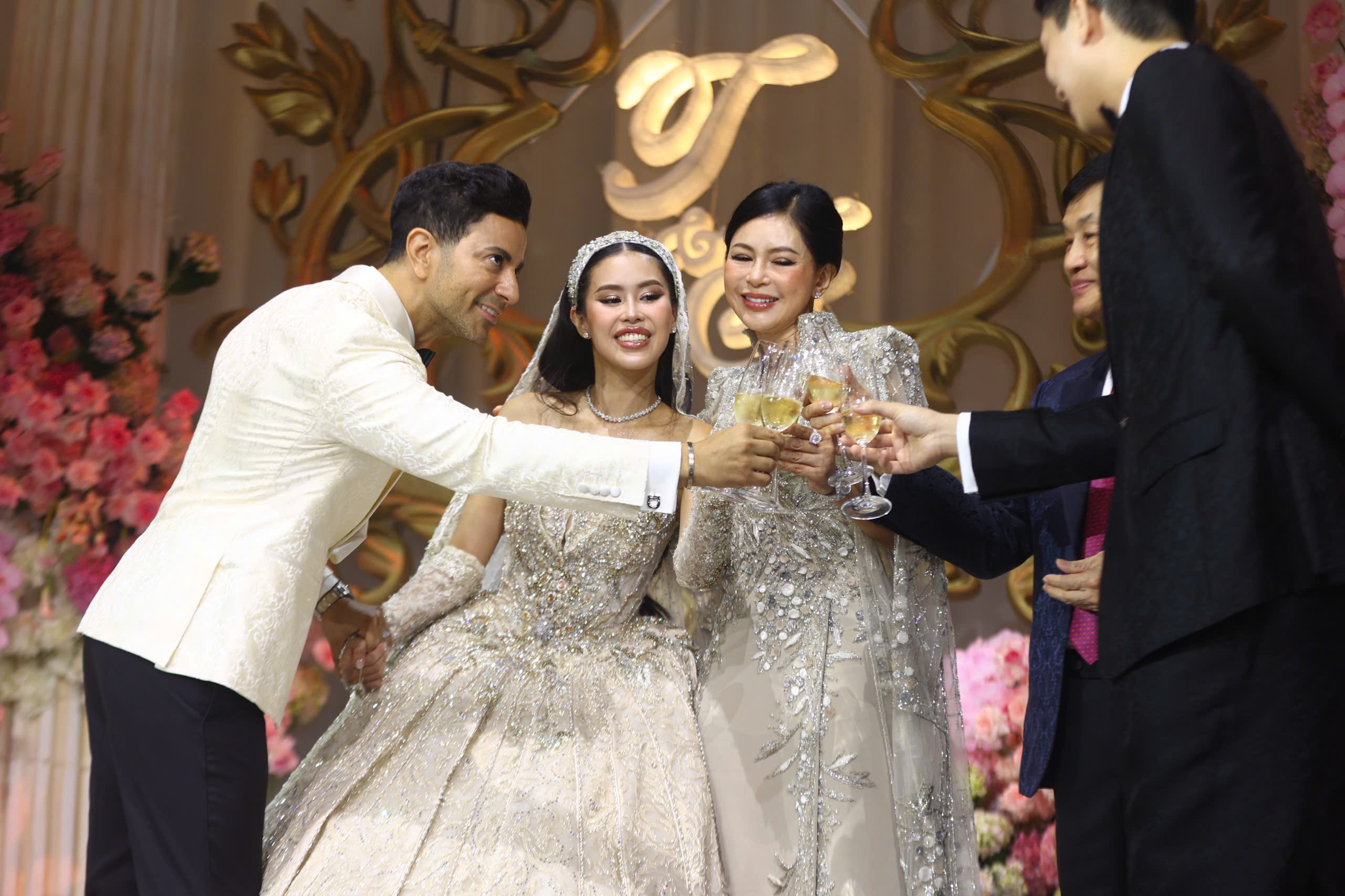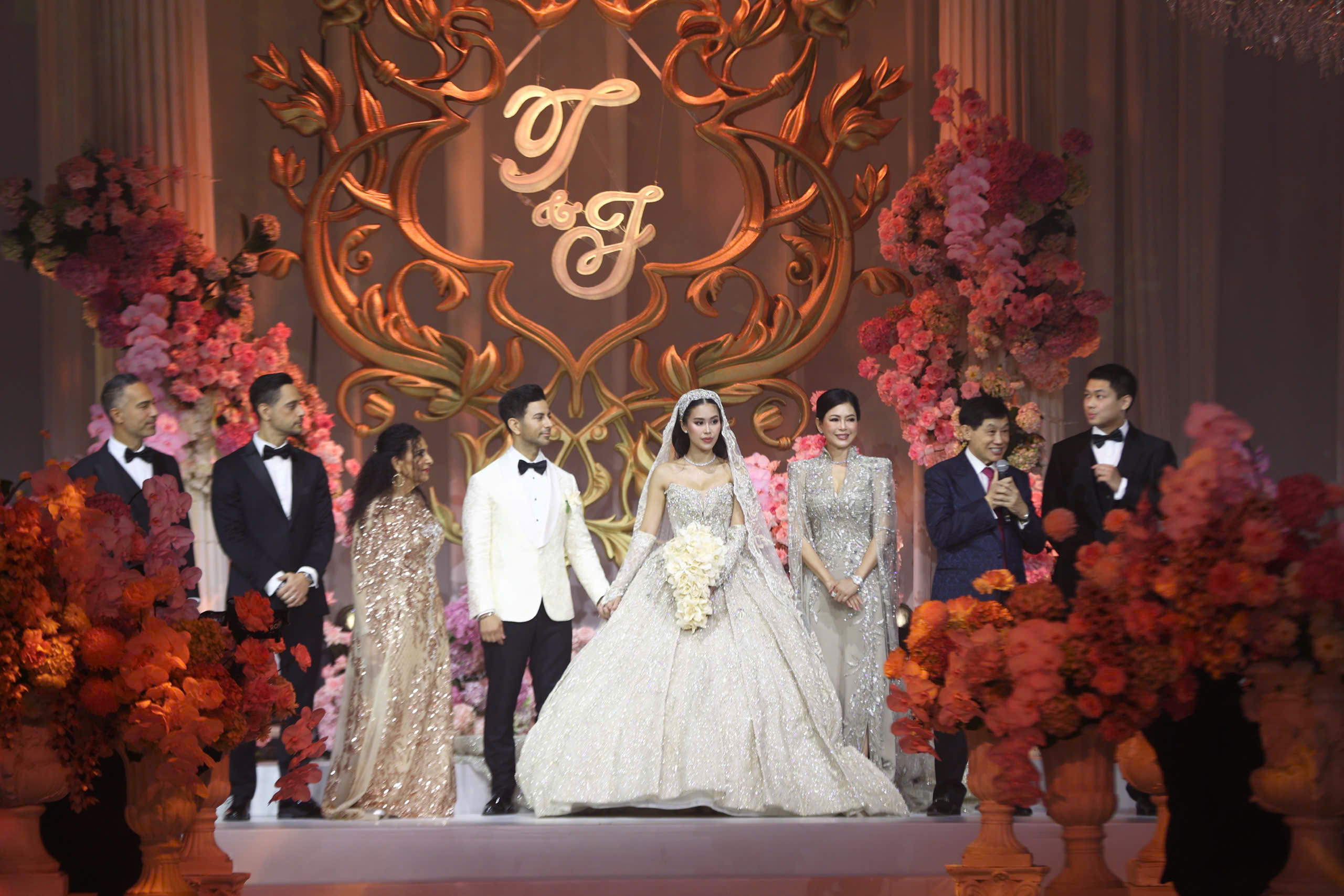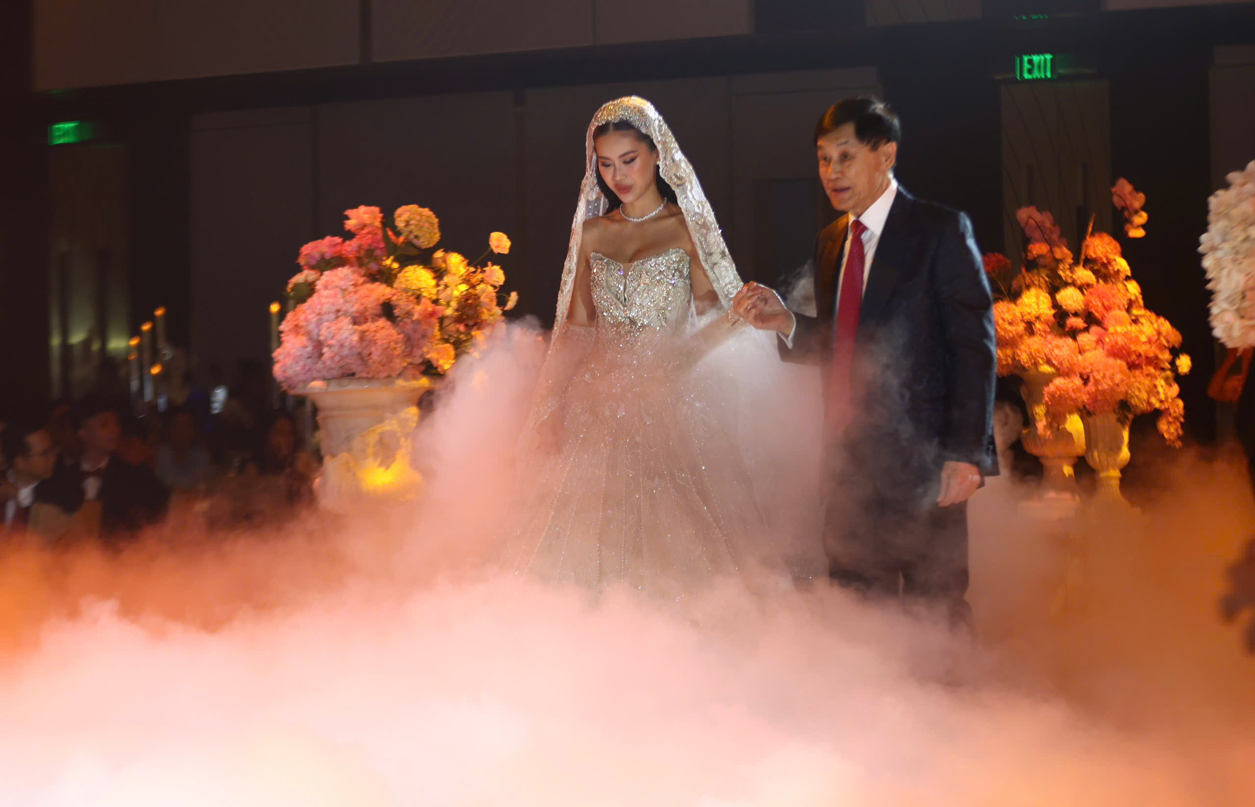 The event began at 19h15 at a high-end convention center in TP HCM. Businessman Johnathan Hanh Nguyen walked his daughter down the aisle. Tien Nguyen, 28, whose real name is Nguyen Thao Tien, is the eldest child of former actress Le Hong Thuy Tien and Johnathan Hanh Nguyen.