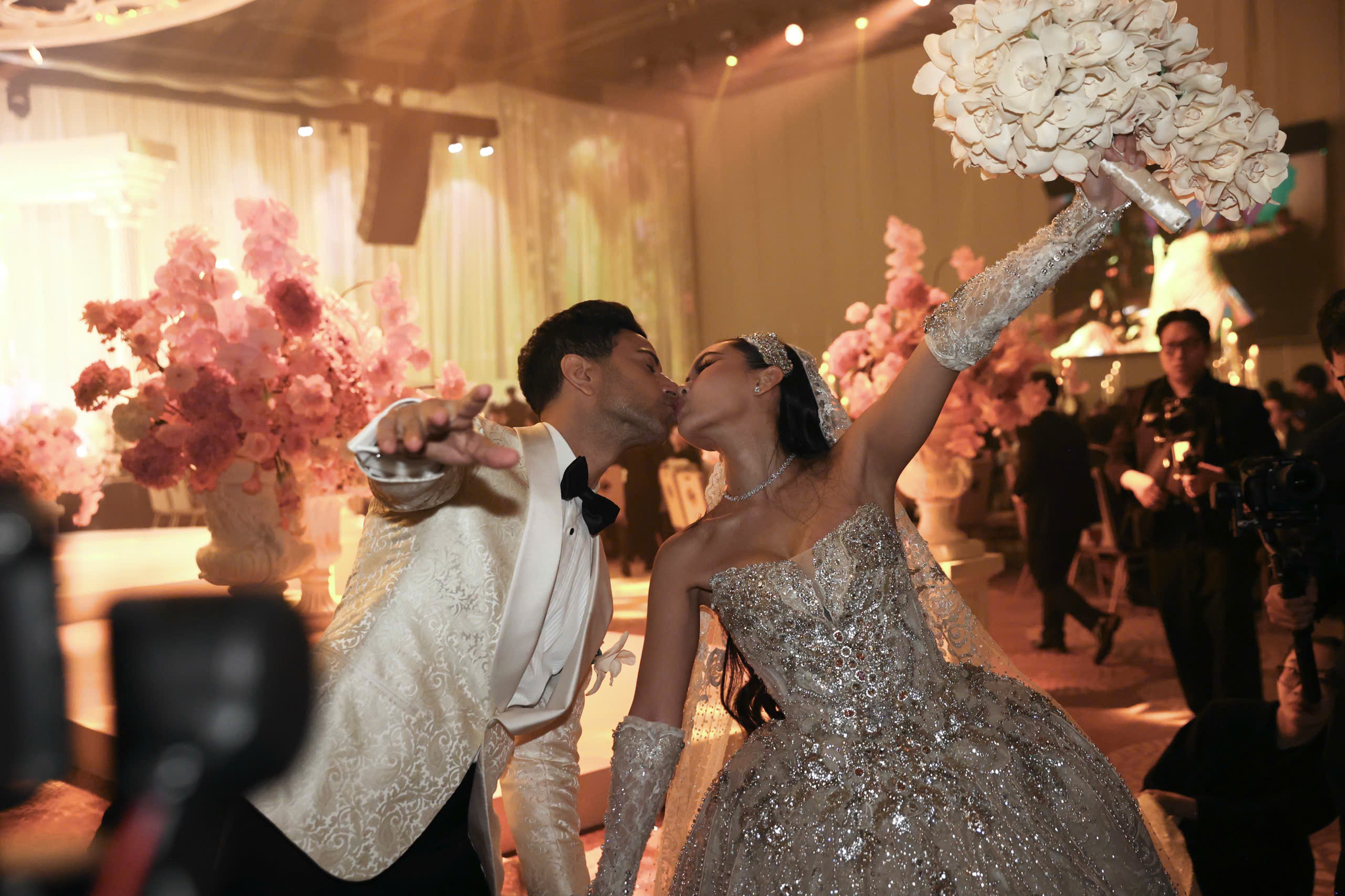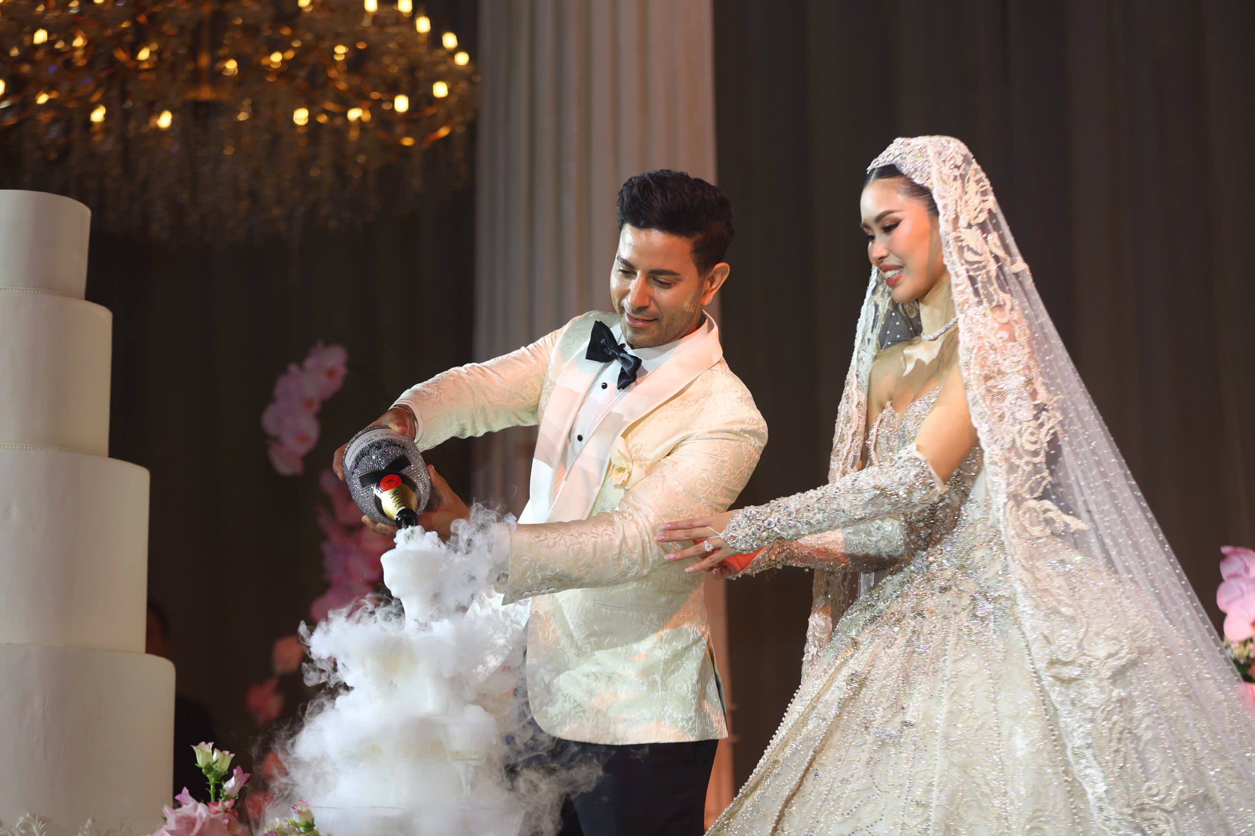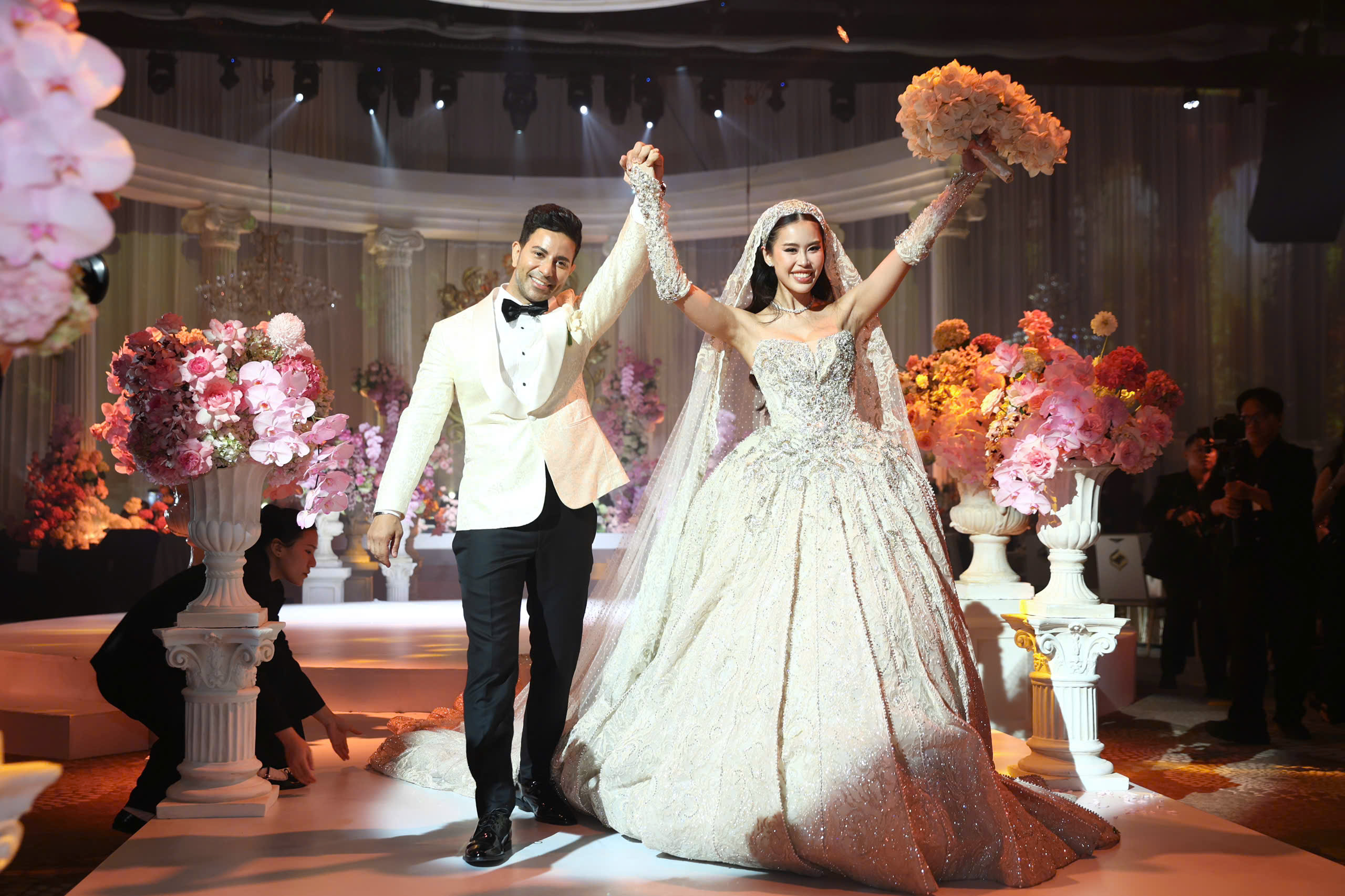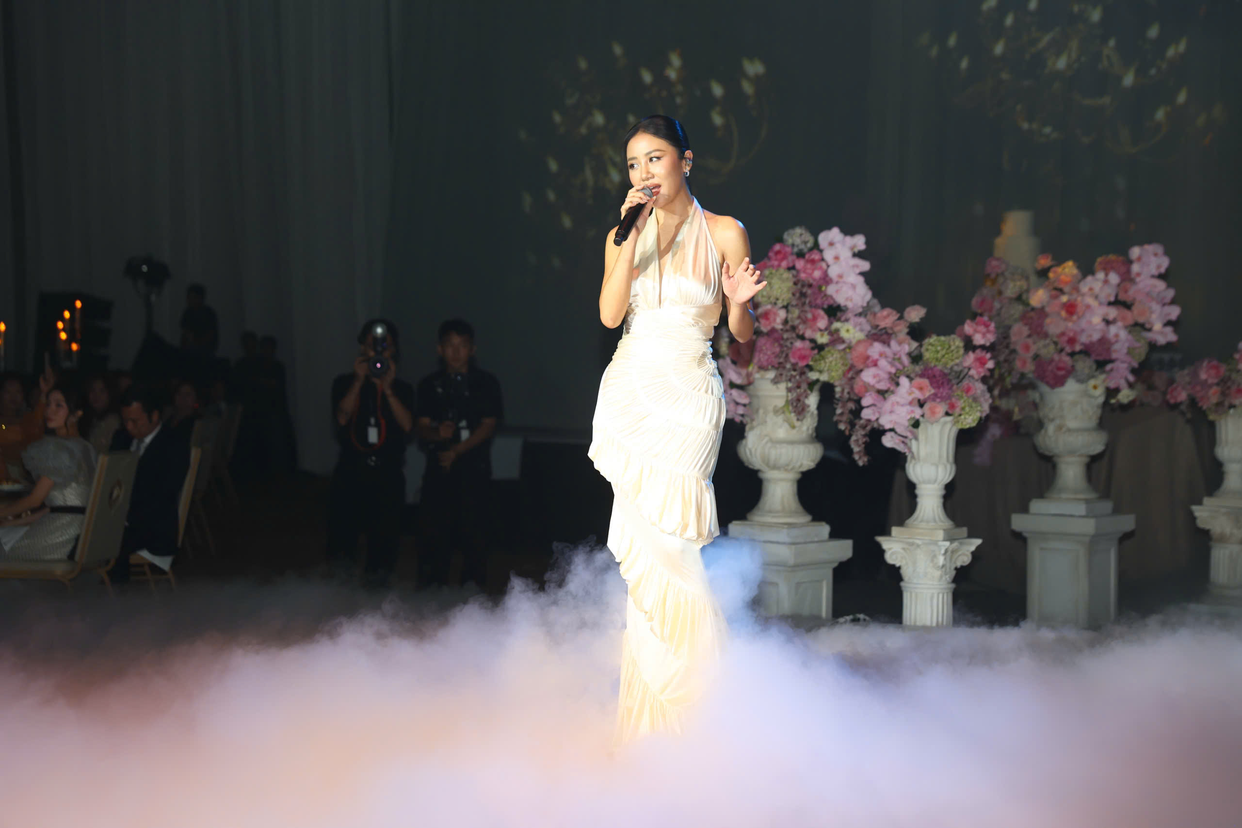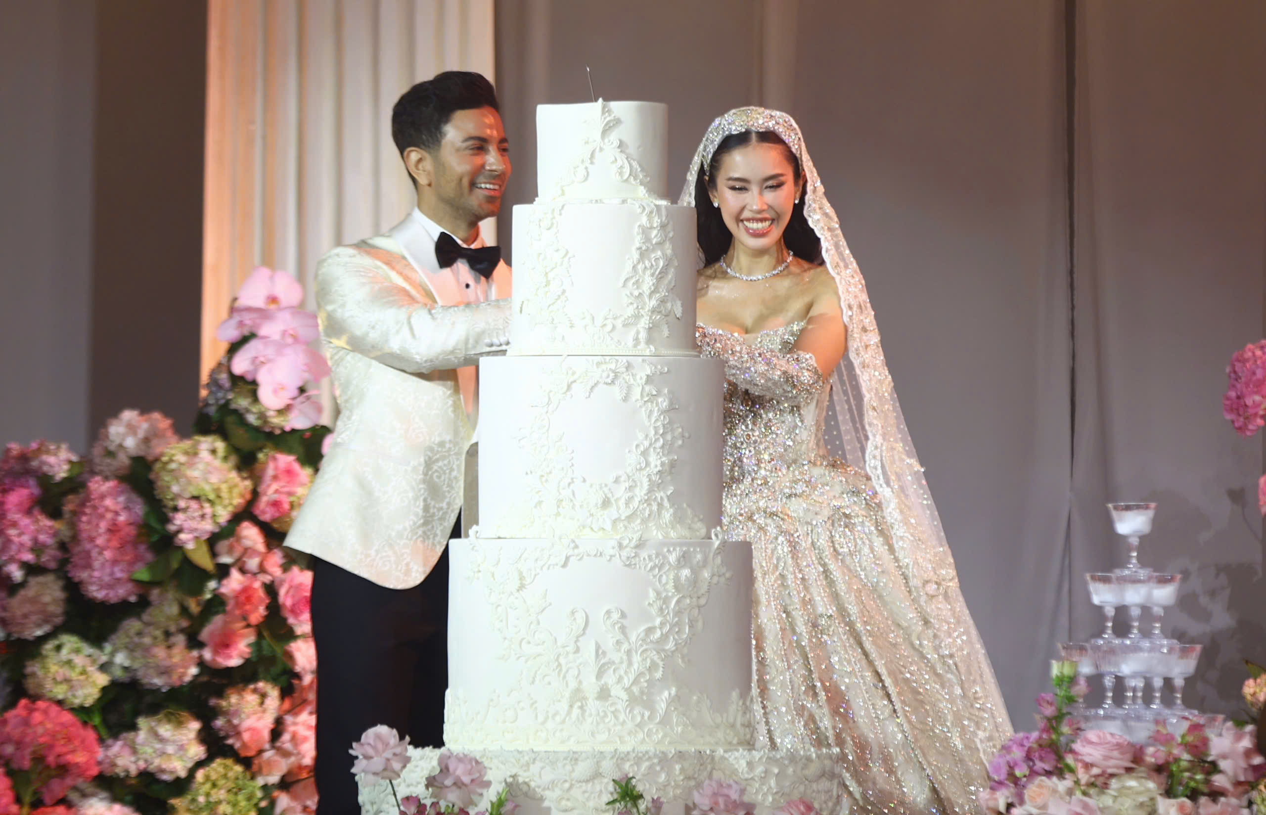The event began at 19h15 at a high-end convention center in TP HCM. Businessman Johnathan Hanh Nguyen walked his daughter down the aisle. Tien Nguyen, 28, whose real name is Nguyen Thao Tien, is the eldest child of former actress Le Hong Thuy Tien and Johnathan Hanh Nguyen.