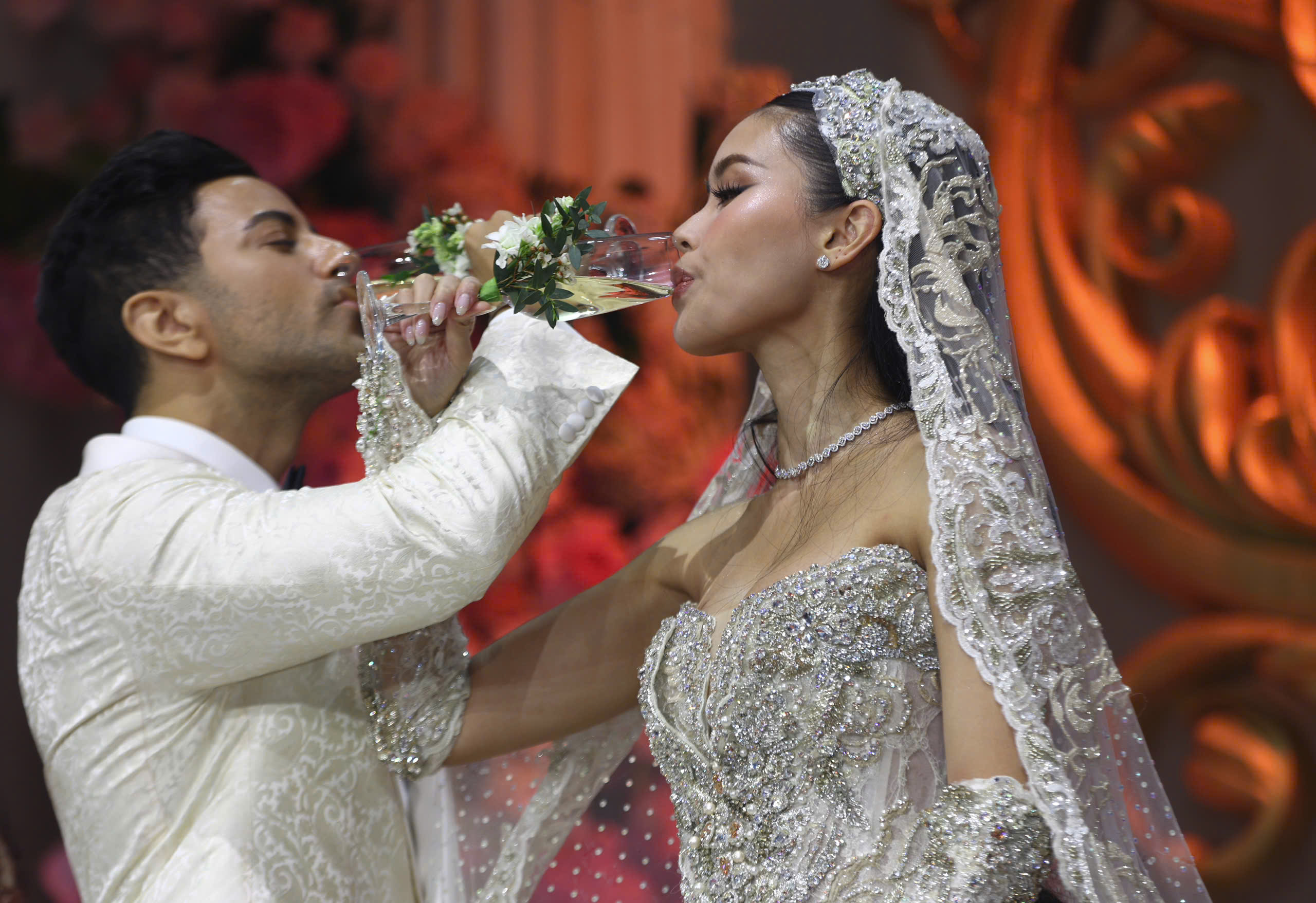 They performed the "giao boi" (cross-cupping) wine ritual to conclude the ceremony, before joining guests for the reception. |