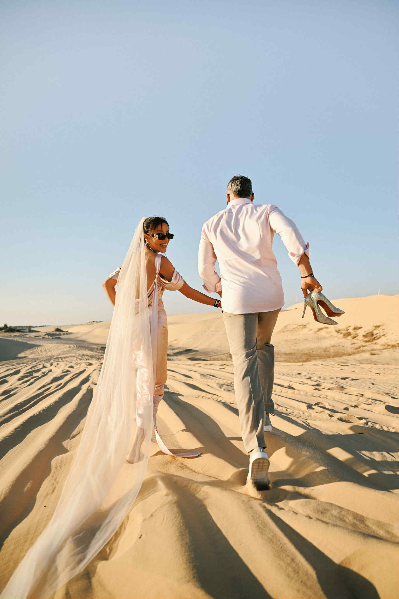 For the photoshoot, Bao Truc wore a short, strapless wedding dress made from tulle and organza, a style she personally selected and custom-made to suit her sensual aesthetic. Mike opted for a relaxed, beach-inspired look with a linen shirt. Bao Truc expressed her desire for simple, uncomplicated commemorative photos, prioritizing genuine emotion over elaborate concepts or attire. The couple, along with their team, completed the entire shoot in one session, comfortably expressing their feelings without needing to pose for the camera, particularly enjoying their time at the sand dunes where they combined sightseeing with photography.