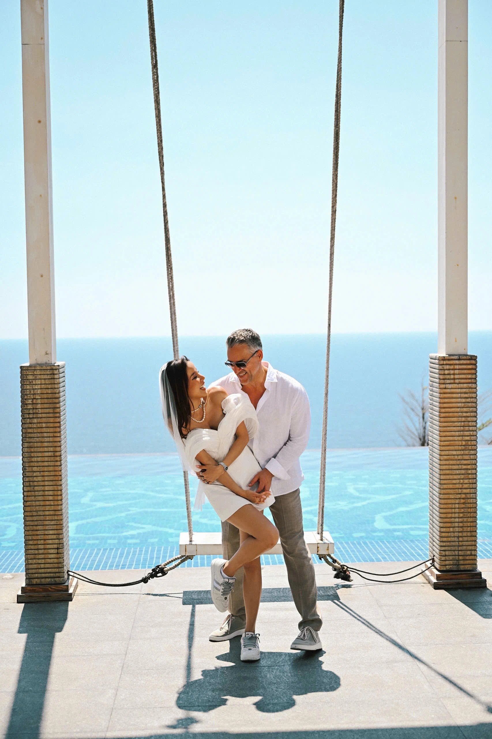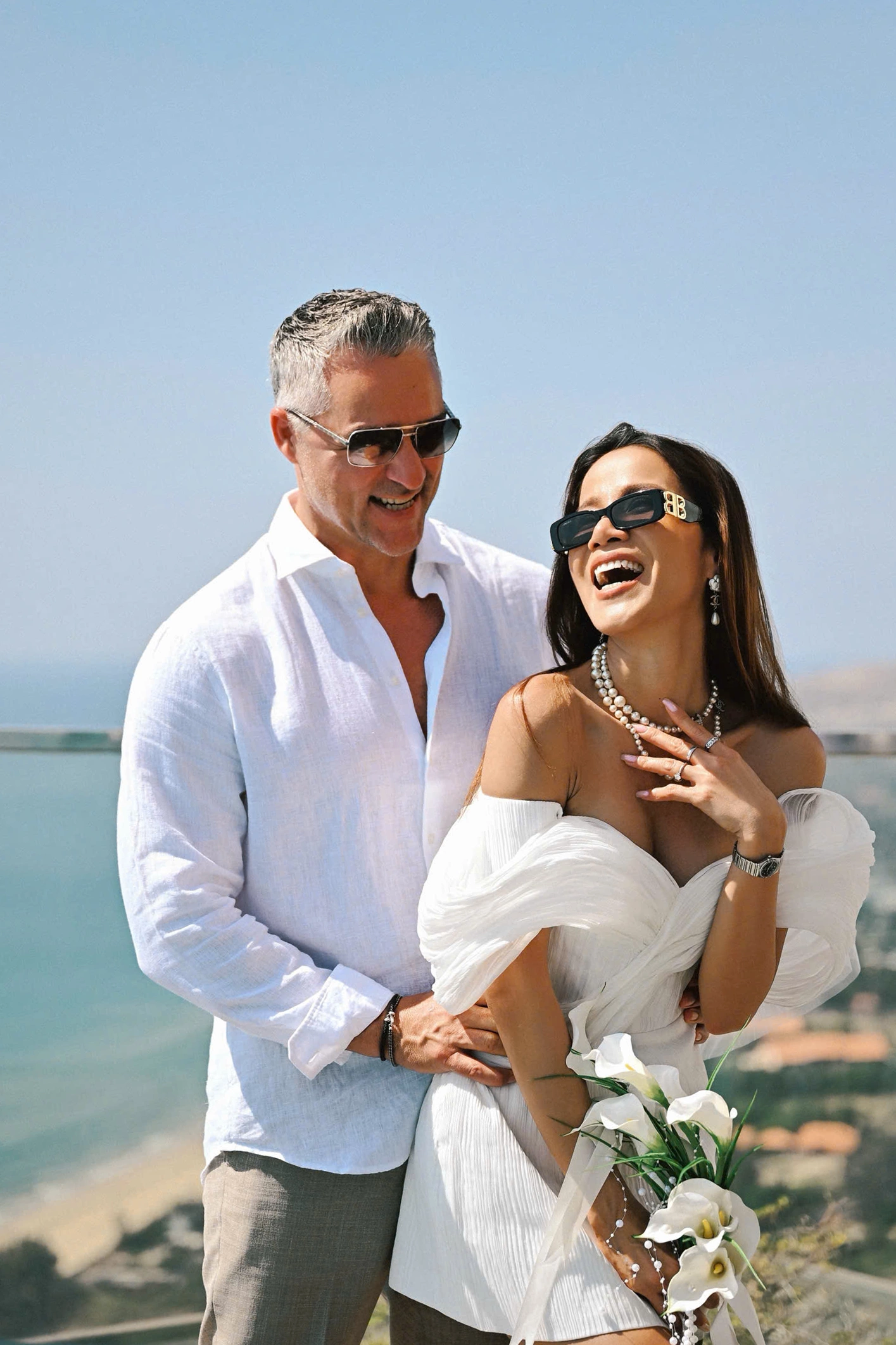 Actress Bao Truc, 40, and German businessman Mike, 56, recently completed their wedding photoshoot in Phan Thiet, featuring stunning backdrops of an infinity pool and sand dunes. The couple, who met in late 2025, returned to Vietnam from Germany in late March to prepare for their wedding ceremony. They plan to hold their nuptials at a luxury resort in Da Nang in July, following six months of dating.