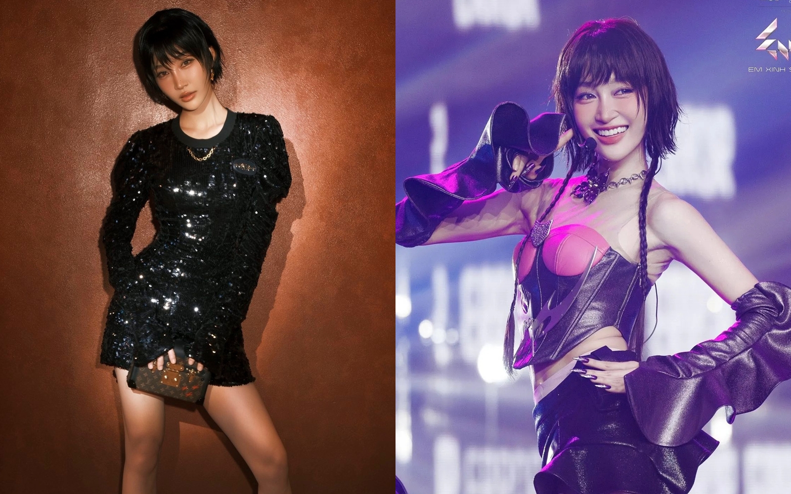 Juky San's style exudes femininity with a touch of anime. The 27-year-old singer builds her image based on a pop idol aesthetic, which is diverse, dynamic, and rebellious. Her fashion blends Y2K, preppy, and modern elements. Known by her real name Tran Thi Dung, she rose to prominence after participating in season 6 of Giong Hat Viet. Juky San is famous for songs like "Phai chang em da yeu", "Nghi den anh", "Em la Coffee", and "Xe dap oi".