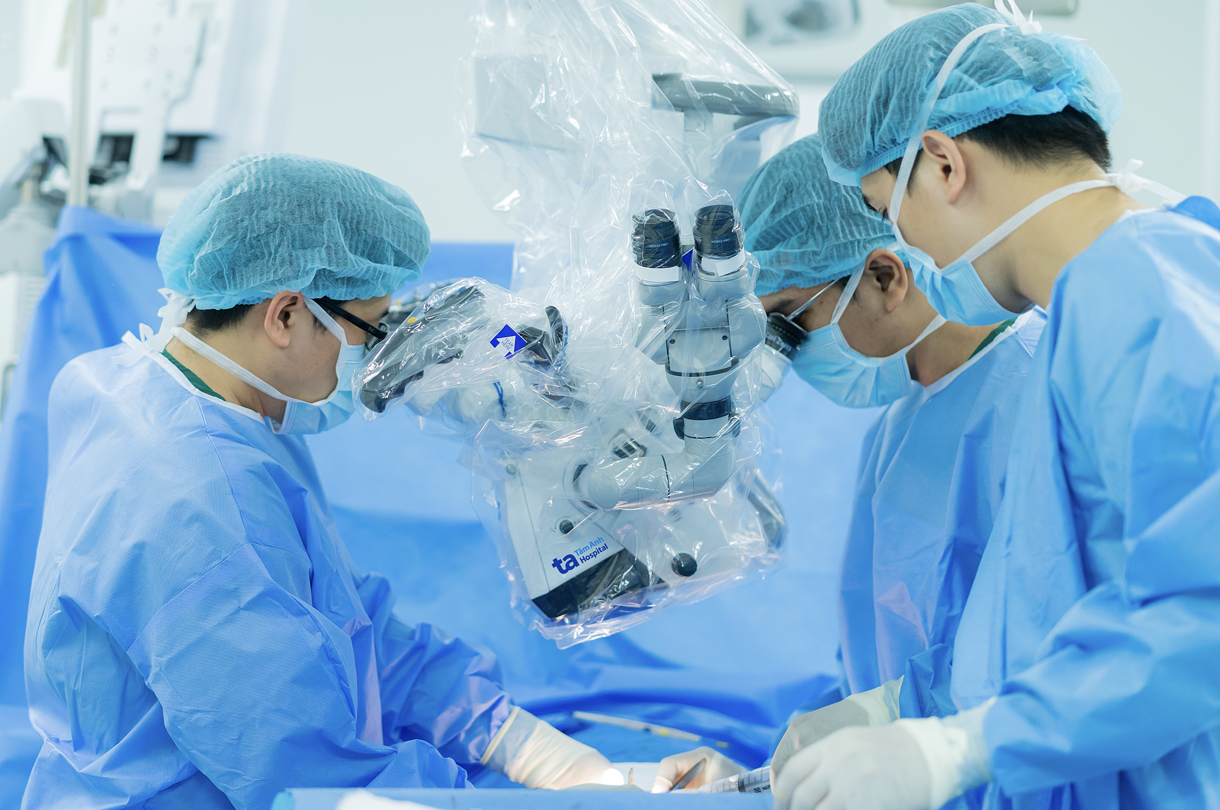 Dr. Duong Quang Huy (left) and the surgical team perform a microsurgical cross-connection of the sperm duct. Photo: Hoai Thuong |