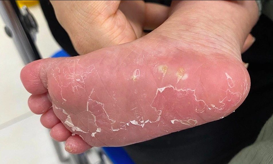 A baby with peeling skin on hands and feet shortly after birth – a sign of congenital syphilis. Photo: Thu Ngo |