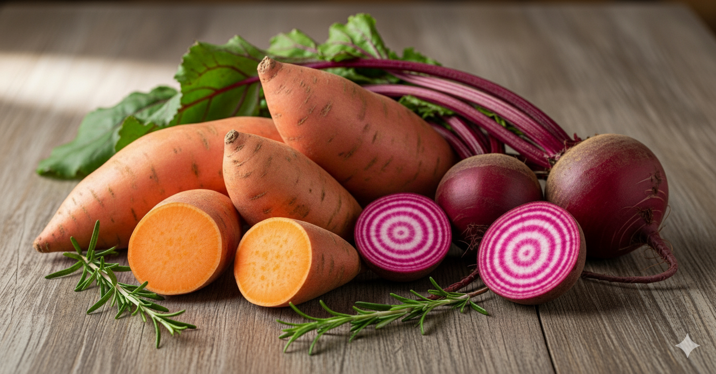 Sweet potatoes and beets both provide nutrients beneficial for the eyes. Image generated by AI. |