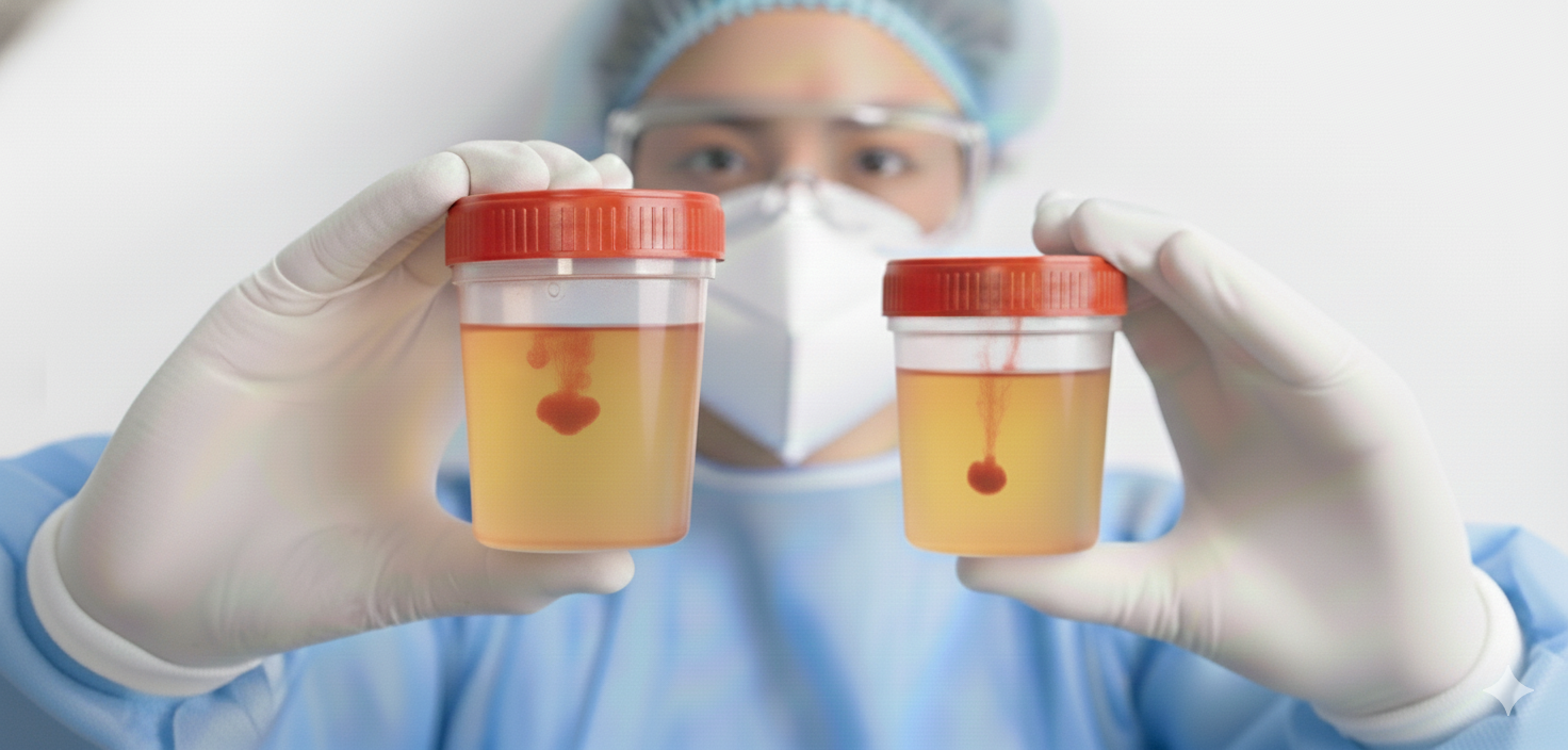 Blood in urine may indicate bladder or prostate cancer. AI image