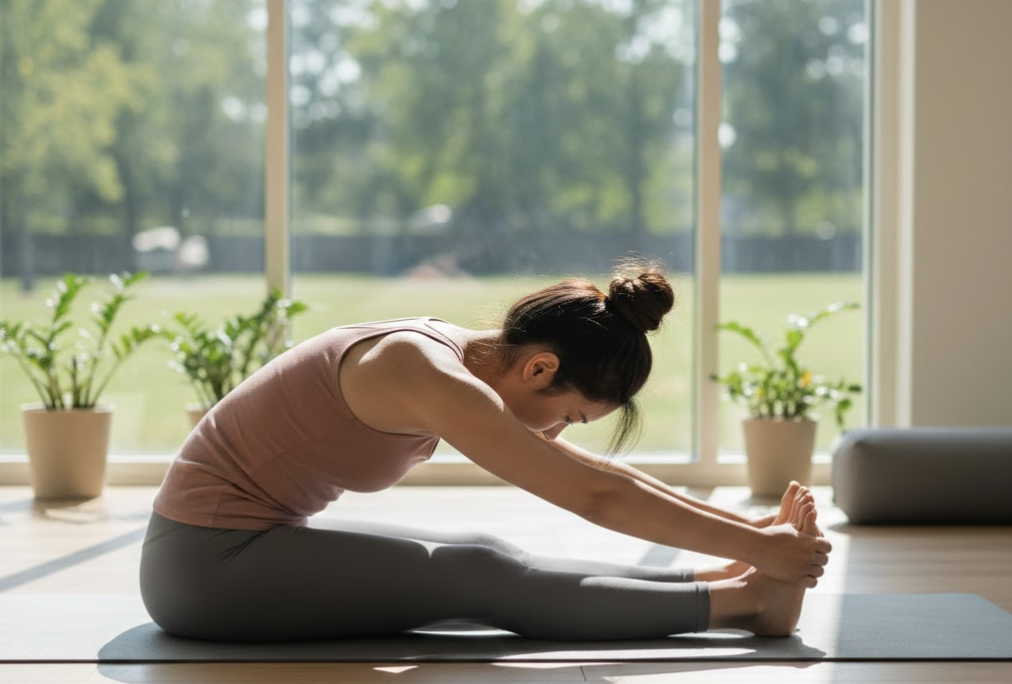Execution: Sit with a straight back, legs extended forward. Inhale, bring your two arms up, then exhale and fold forward from your hips, lengthening your spine while reaching forward to touch your feet, ankles, or shins, keeping your back as straight as possible. Tighten your abdominal muscles and breathe deeply to relax, feeling the stretch in your hamstrings and spine.