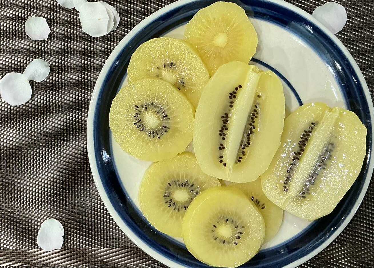 **Kiwi** is a nutrient-dense fruit, rich in fiber, minerals, and antioxidants, including vitamin C. Its high fiber content enhances satiety, curbs cravings, and aids in controlling calorie intake. Kiwi can be enjoyed after meals, blended into smoothies, or incorporated into desserts like jelly.