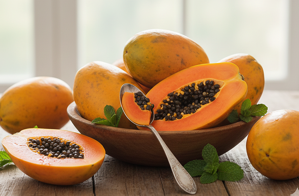 Papaya contains vitamin C, vitamin A, lycopene, and one type of enzyme called papain. Papain can aid in food digestion, and when food breaks down more easily during digestion, bloating is reduced. It is advisable to eat ripe papaya rather than raw papaya. Consuming many salads made from unripe papaya can cause stomach coldness and disrupt digestion. |