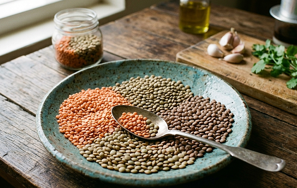 Lentils provide folate, iron, and insoluble fiber (about 6 g per 100 g serving). They have a rich flavor, are easy to prepare, and can be stewed with meat, made into sweet soup, or used in savory soups, depending on preference. Lentil salad with shrimp or tuna, topped with nuts, offers a complete range of nutrients.