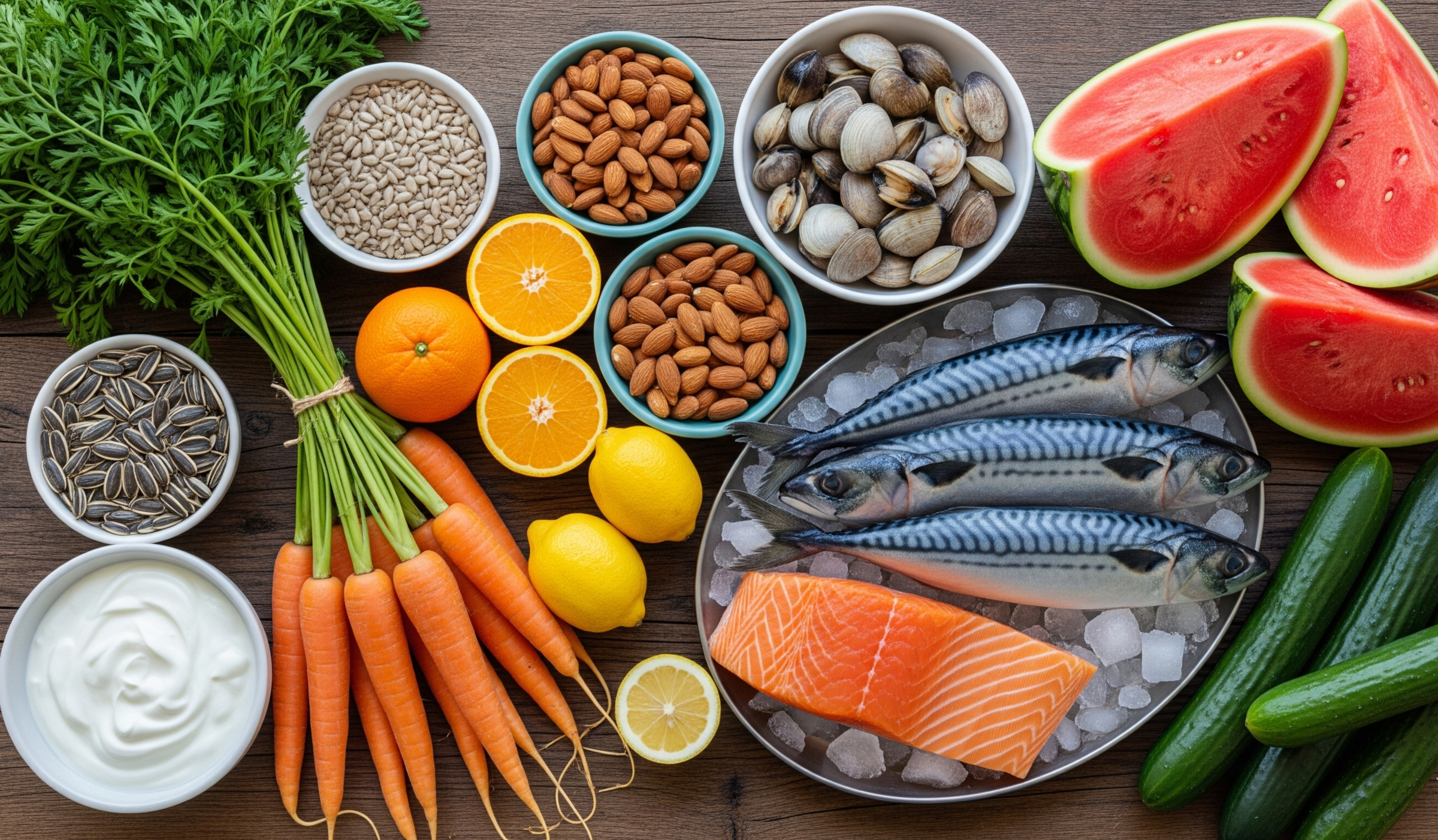 Beta-carotene (provitamin A) can protect skin from UV rays, reduce DNA damage, and enhance cell turnover. Vitamin A also supports balanced sebum production, preventing dry skin. Foods rich in vitamin A include carrots, sweet potatoes, pumpkin, spinach, kale, mangoes, and papayas.
