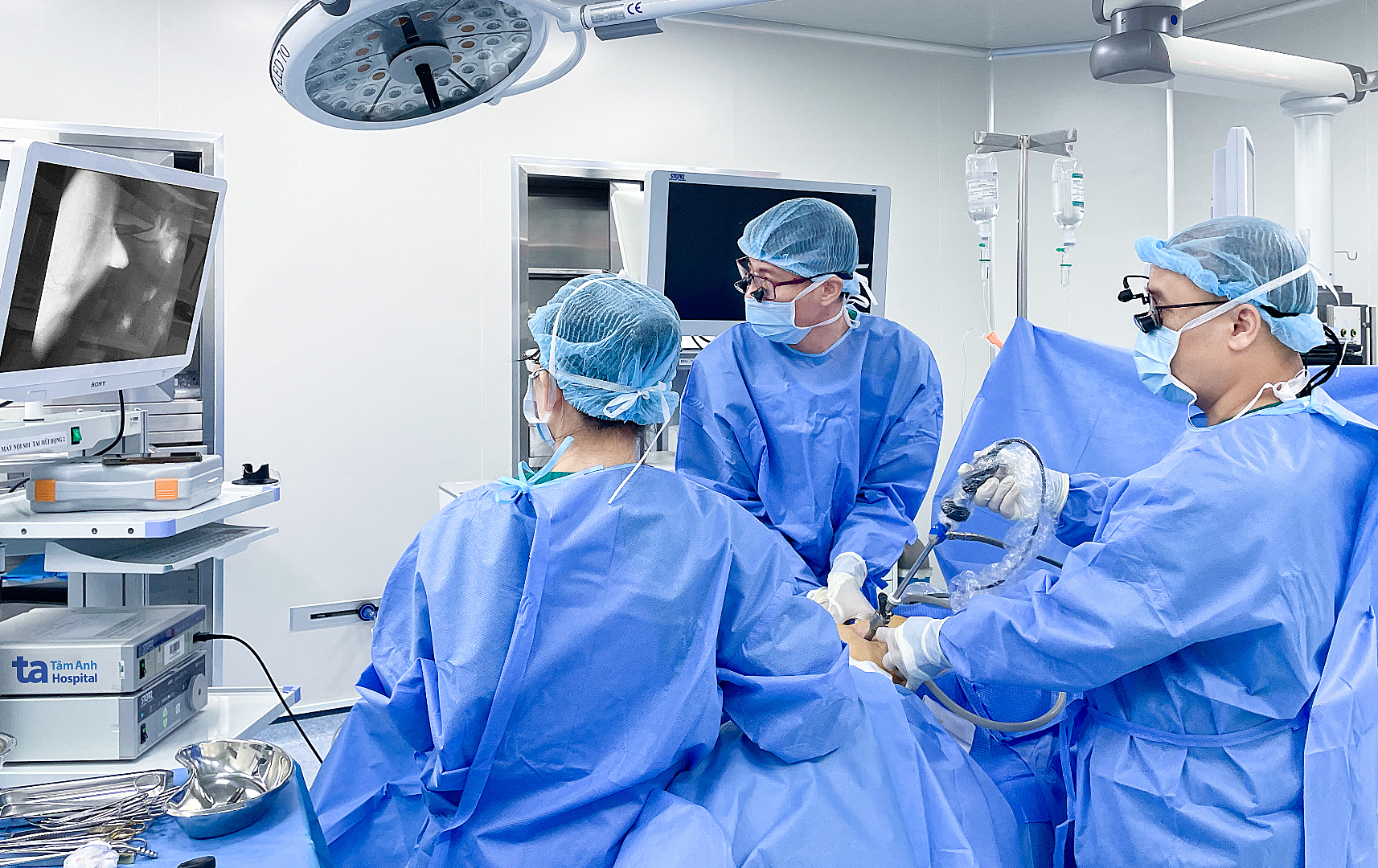 Dr. Trong (far right) performs laparoscopic surgery on a pediatric patient. Photo: Tam Anh General Hospital |
