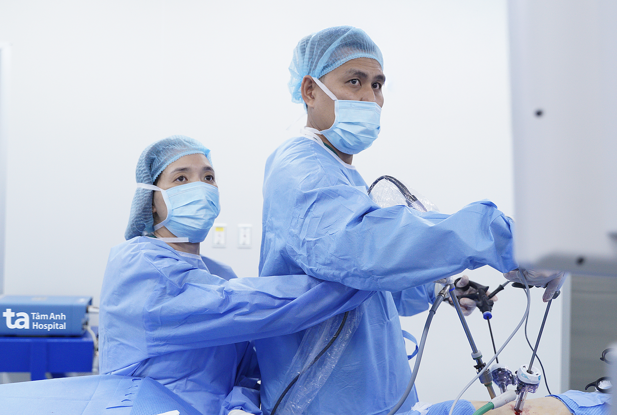 Doctor Lien and Doctor Cao Vinh Duy performing laparoscopic adrenalectomy on Ms. Dau. Photo: Tam Anh General Hospital |