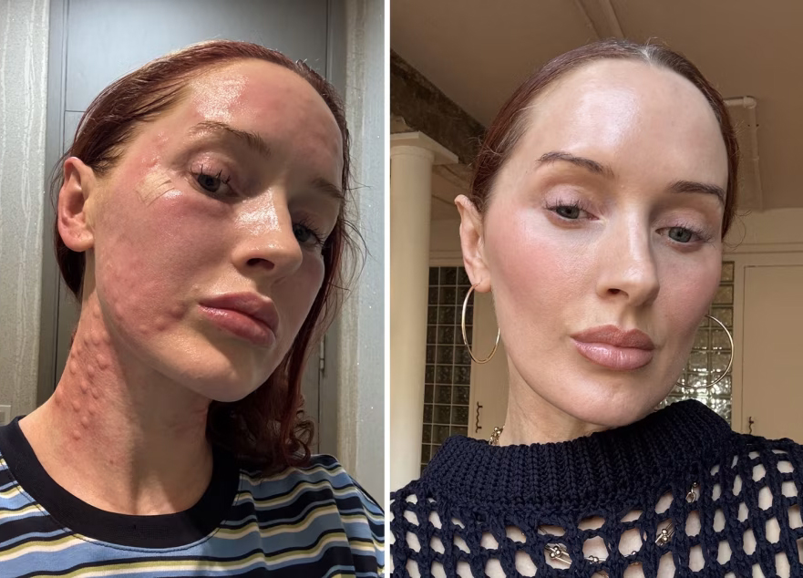 New York facialist Sofie Pavitt's face during the Rejuran injections in Seoul (left) and six weeks later. *Photo: Sofie Pavitt* |