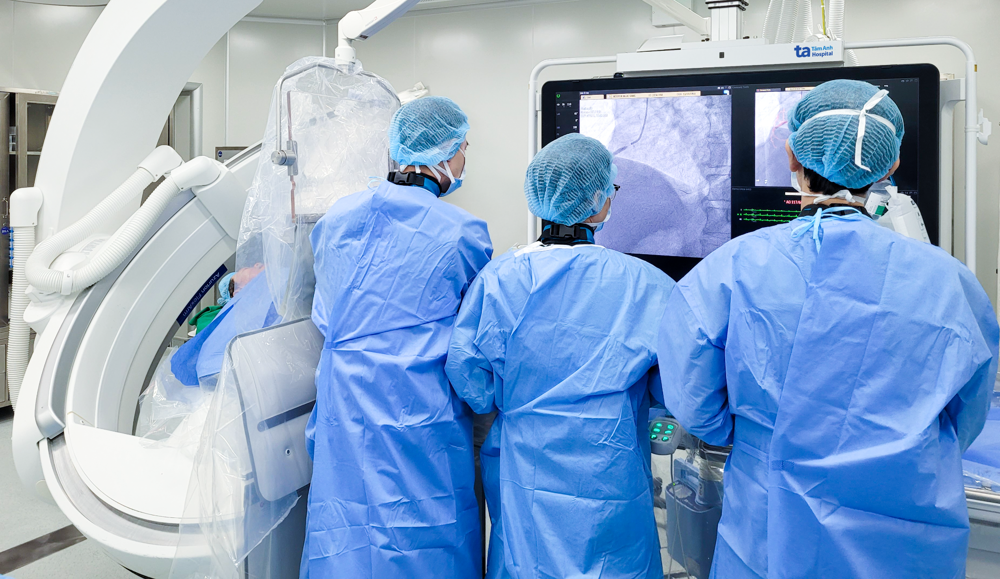 The team immediately transferred the patient to Tam Anh General Hospital TP HCM. Dr. Nguyen Minh Chau of the Interventional Cardiology Center placed two appropriately sized stents to expand the vessel lumen and restore blood flow to the heart via the right coronary artery and the circumflex artery. The lesion in the left anterior descending artery did not require immediate treatment; doctors would monitor it and intervene at an appropriate time.