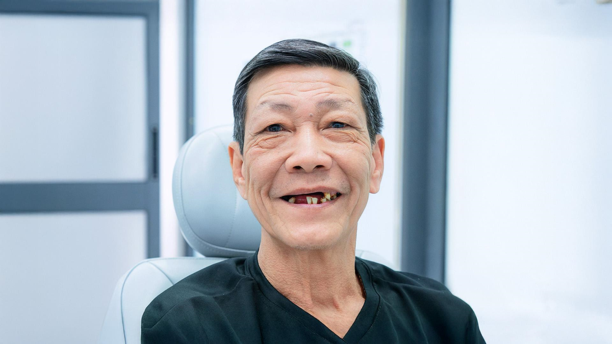 Due to age and chronic periodontitis, Mr. Dinh had lost many upper and lower teeth. Previously, he relied on removable dentures for eating, but over time, they became increasingly loose, rubbing against his gums and causing pain and discomfort. This prevented him from enjoying his favorite foods.