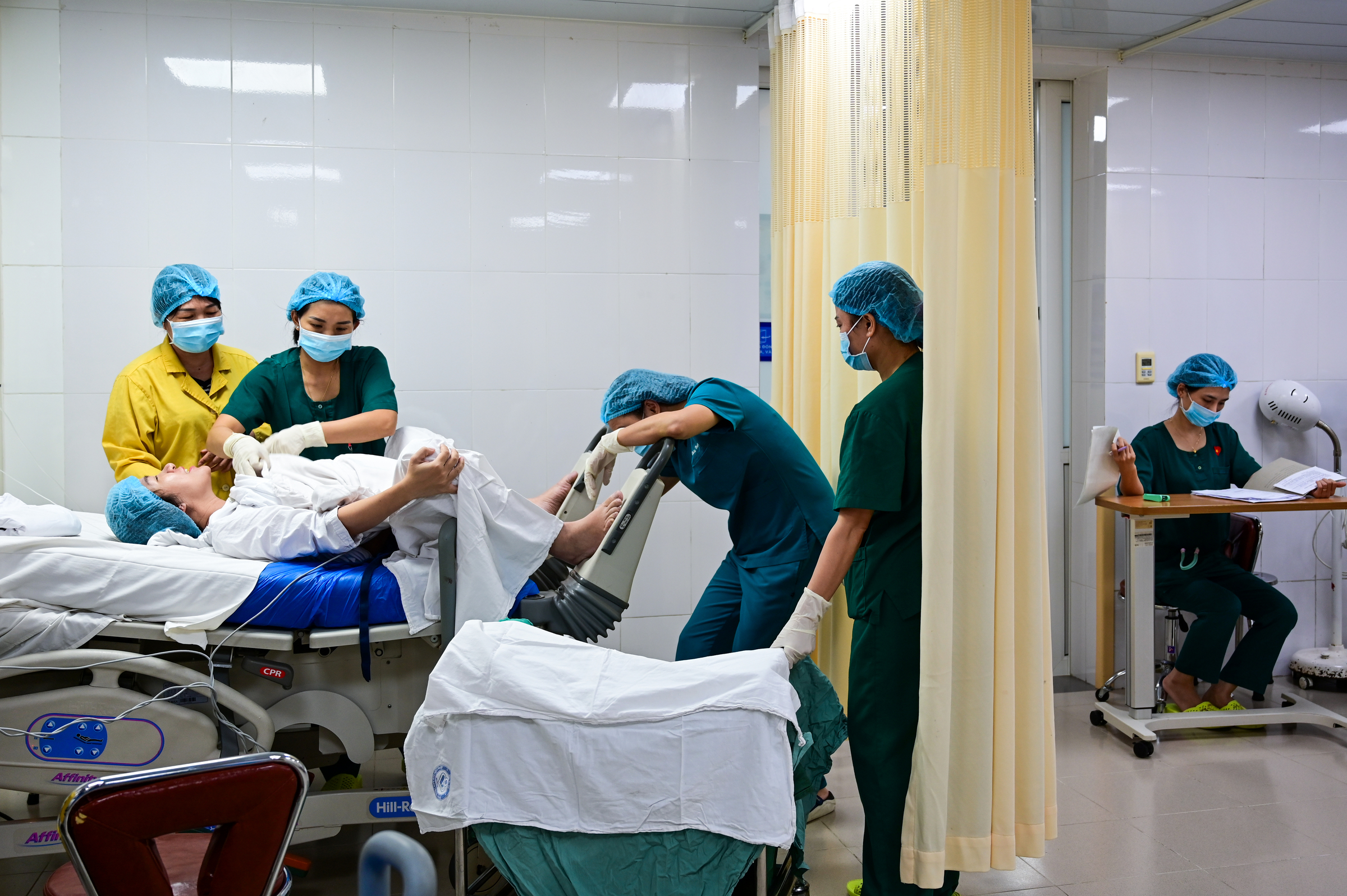 Ms. Ha (in yellow) is next to her daughter during labor at the national hospital of obstetrics and gynecology. Photo: Giang Huy |