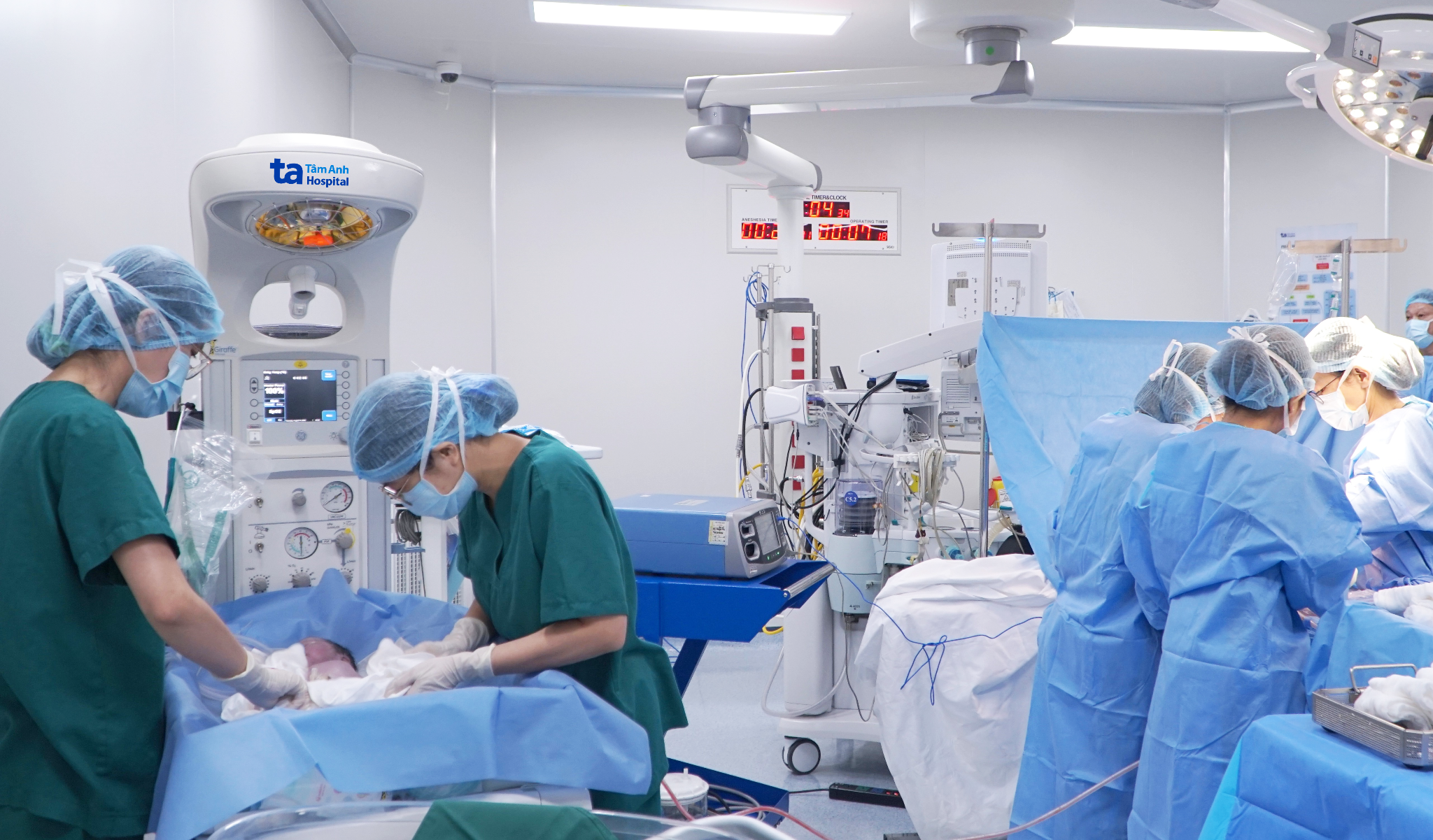 Doctors at the neonatal center examining and assessing the baby boy's health in the operating room. Photo: Tue Diem |