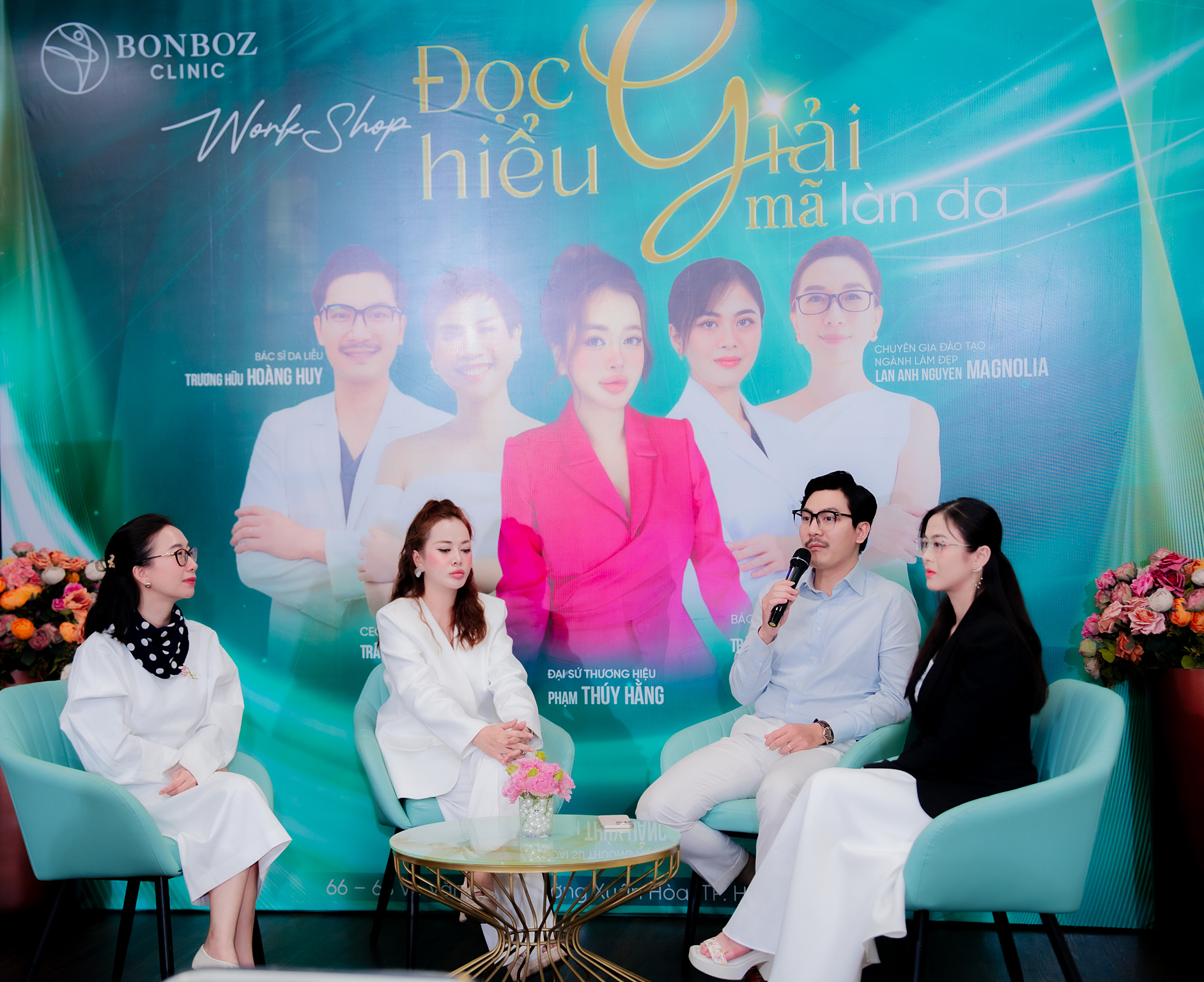 The workshop atmosphere became more open during the dialogue session with dermatologist Truong Huu Hoang Huy, aesthetic doctor Tran Nguyen Thuy Duong, and training expert Lan Anh Nguyen Magnolia. Participants' questions regarding damaged skin recovery, the appropriate age for mesotherapy injections, and home skin care methods were addressed by the experts, tailored to specific skin conditions.