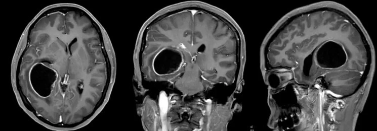 Initial CT and CTA (computed tomography angiography) scans revealed a large space-occupying lesion in the right temporo-parieto-occipital region, accompanied by signs of stroke and hemorrhage within the tumor. Doctors administered anti-edema medication, but the patient's condition remained critical. The local hospital quickly transferred her to Guangdong Brain Hospital 39 that same night.