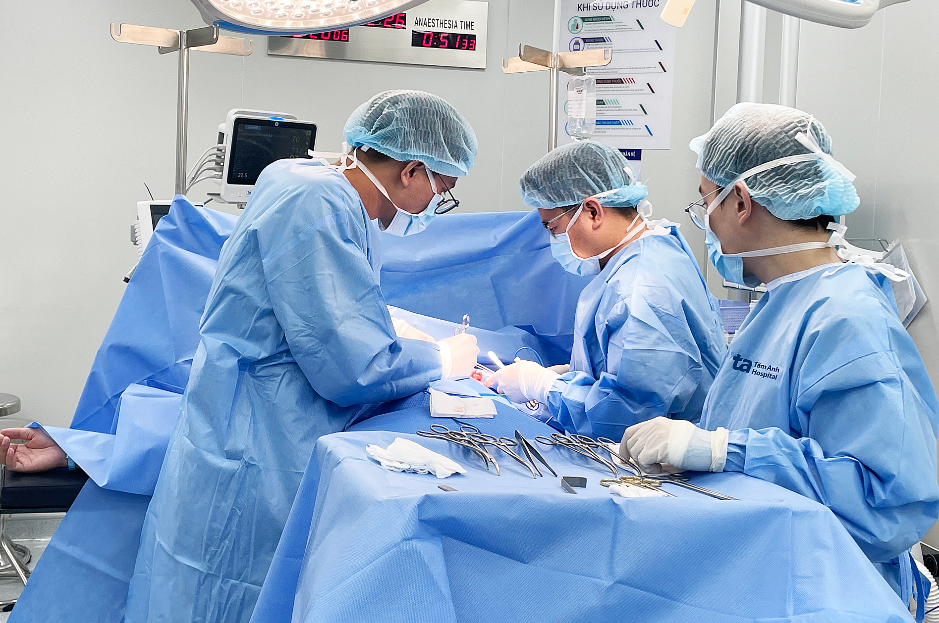 Dr. Huy (center) performs breast glandular tissue dissection surgery for Tim. Photo: Tam Anh General Hospital