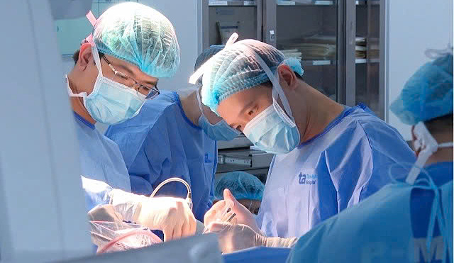 Surgeons operating on a patient with a ruptured aneurysm. Photo: Tam Anh General Hospital |