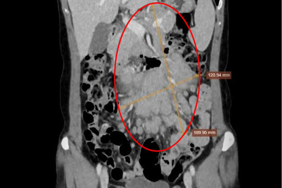 Lien's CT scan shows clusters of lymph nodes, ranging from tiny to large, in her abdomen. Photo: *Tam Anh General Hospital* |