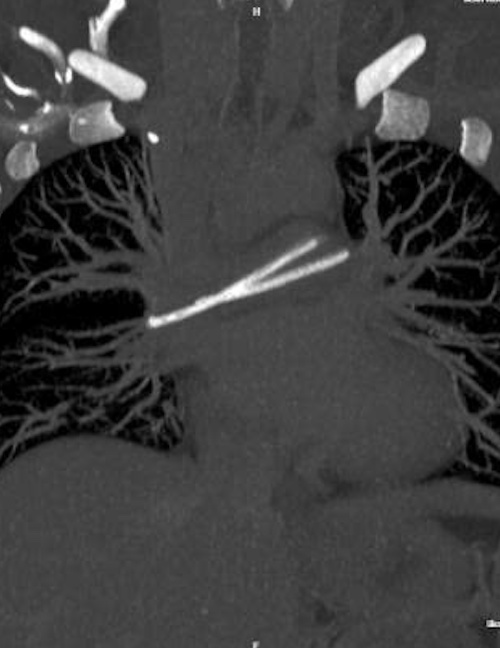 During a routine check-up at a private medical facility, a chest CT scan revealed a foreign object in her heart, stretching across the bifurcation of her pulmonary artery. A subsequent chest X-ray confirmed that the catheter had broken; the port chamber remained under her right collarbone, while the distal segment had migrated into her heart and pulmonary artery. The patient was then transferred to Hospital 175 for treatment.