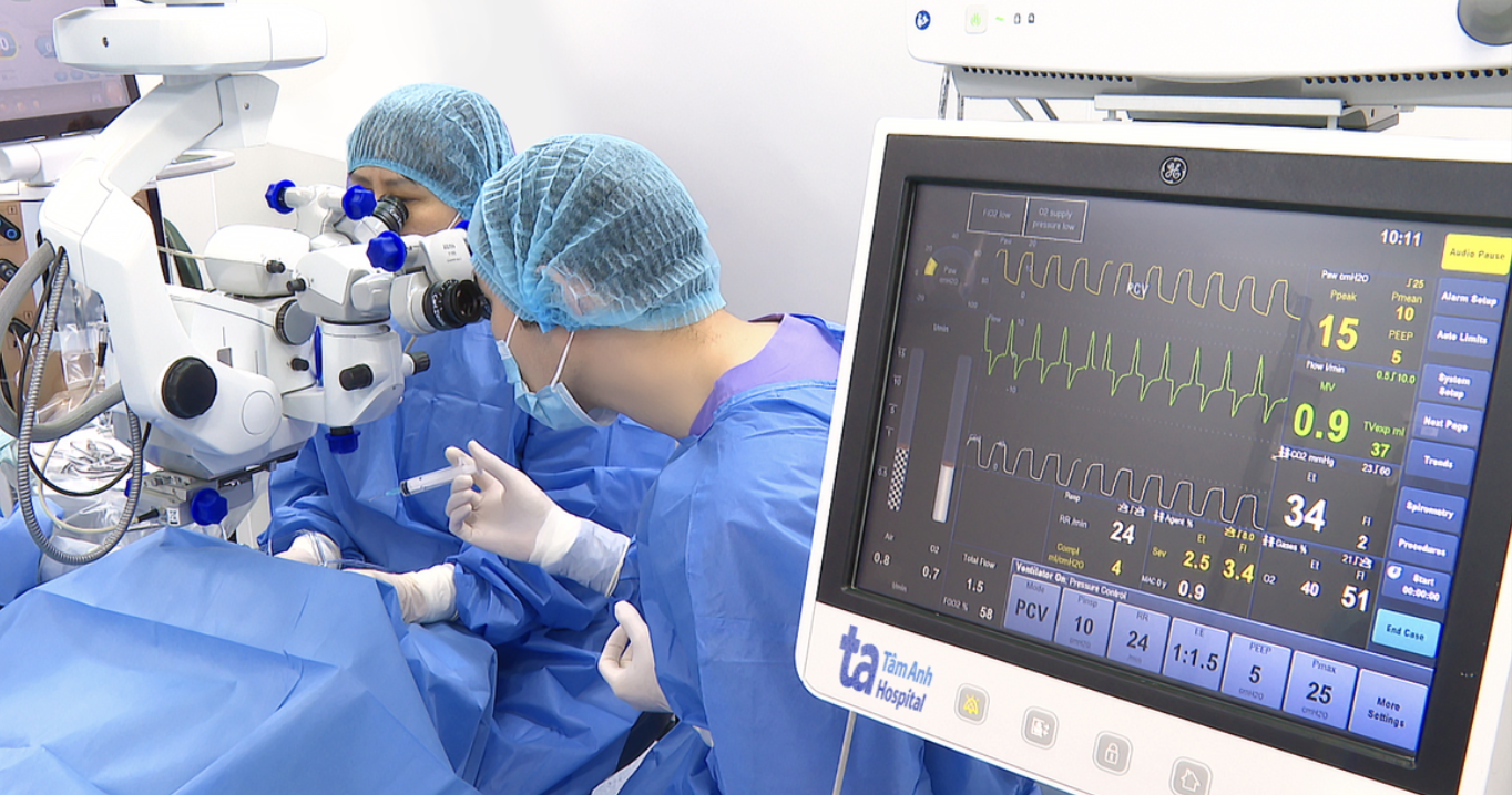 Dr. Hung and Prof. Dr. Hien perform congenital cataract surgery on the 2-month-old girl. Photo: Tam Anh General Hospital