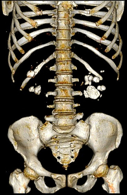CT scan revealing numerous stones densely packed in the woman's kidneys. *Photo: Doctor provided* |