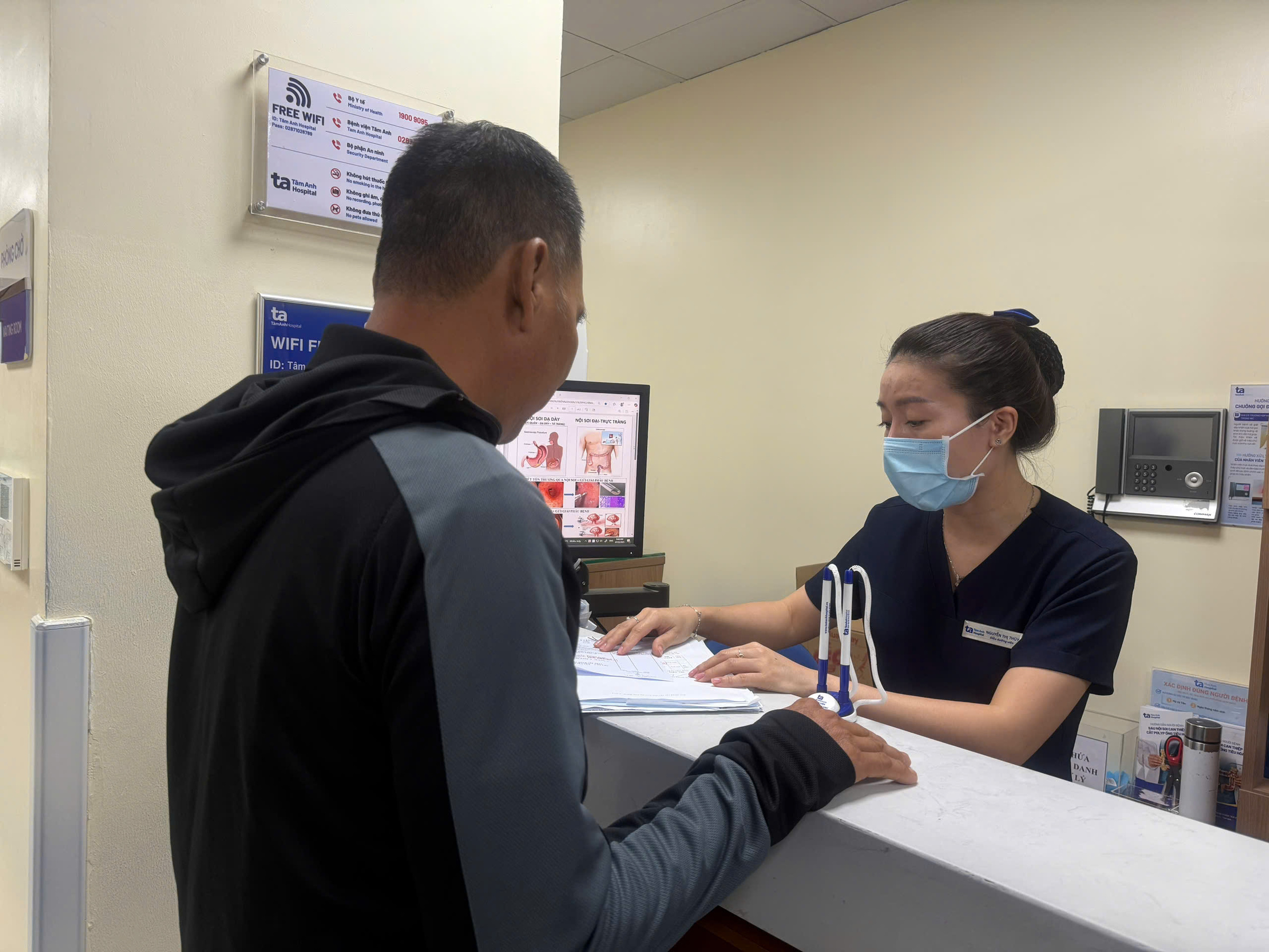 Tri (left) completing discharge procedures. Photo: *Tam Anh General Hospital* |