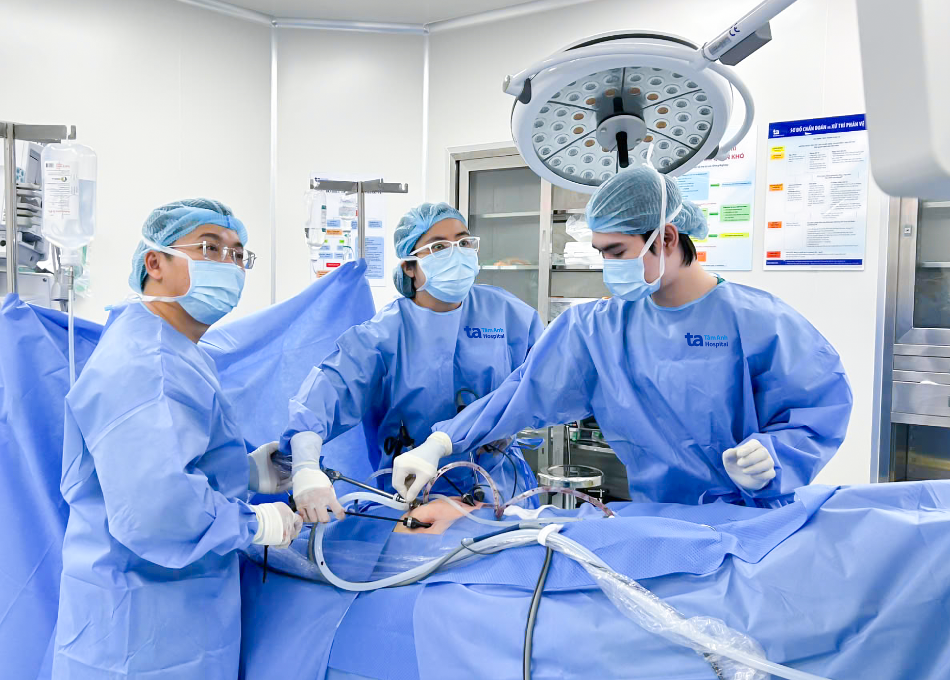 Dr. Yen (center) and her team performing laparoscopic surgery to treat an ectopic pregnancy. *Photo: Tam Anh General Hospital* |