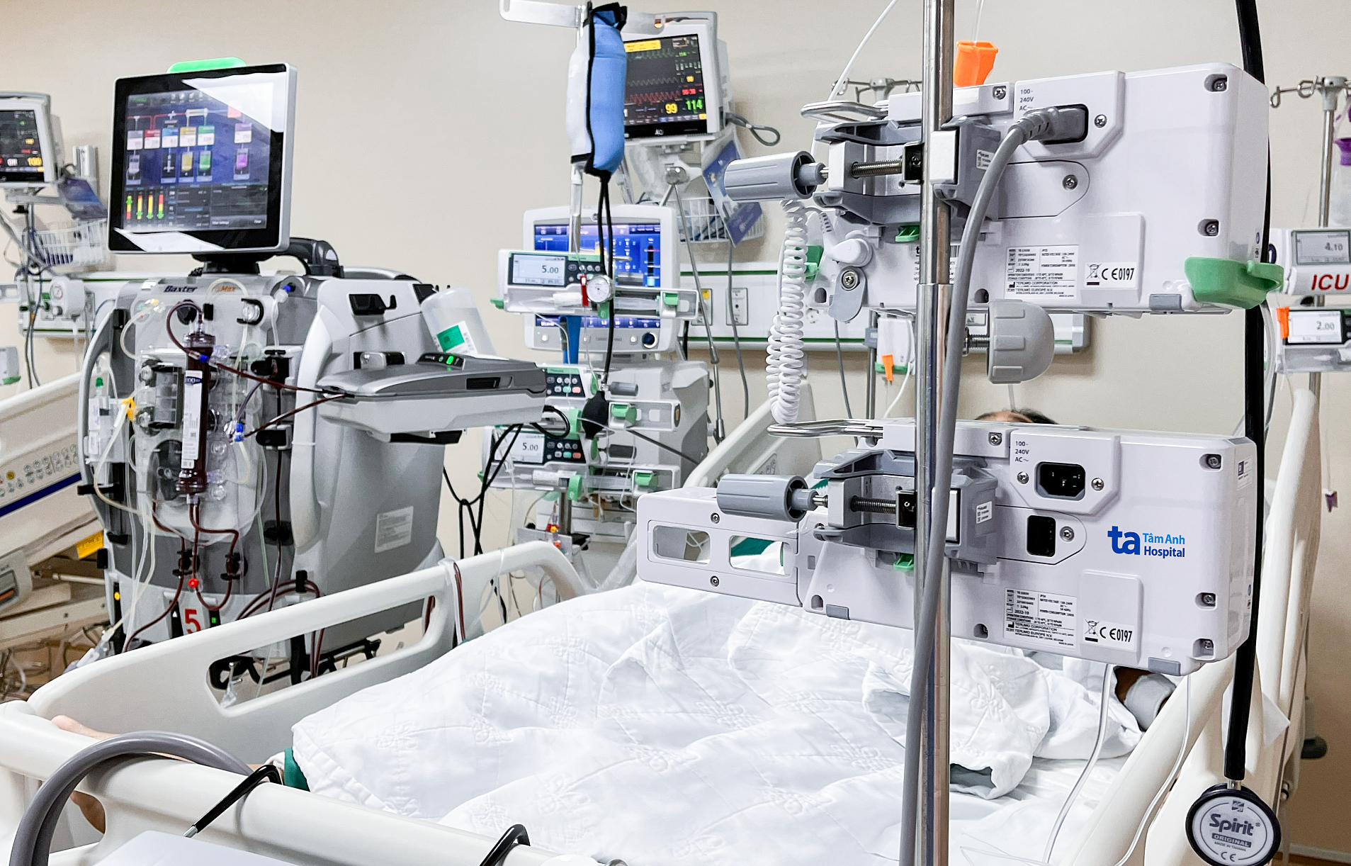 The patient receiving dialysis in the ICU. *Photo: Tam Anh General Hospital* |