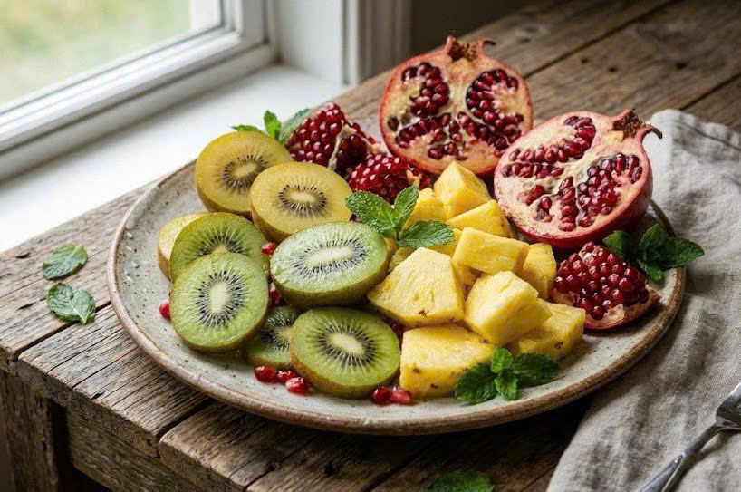 Kiwi is rich in vitamin C and natural serotonin, which supports sleep regulation and reduces stress. The vitamin C in kiwi helps lower cortisol levels in the blood, thereby decreasing feelings of fatigue and anxiety during prolonged stress.