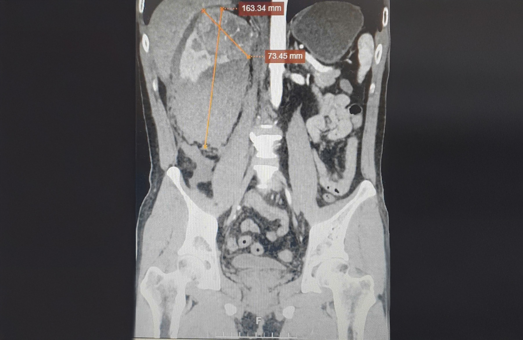 Due to the tumor's size, kidney-sparing surgery was not possible. The doctors decided on a laparoscopic right nephrectomy, removing the ruptured kidney tumor and completely dissecting the hematoma around the kidney, to avoid the risk of cancer cell spread if it were malignant. The specimen removed from the patient's body was sent for pathological analysis, and one week later, the results confirmed clear cell renal cell carcinoma (ccRCC), stage T2a.